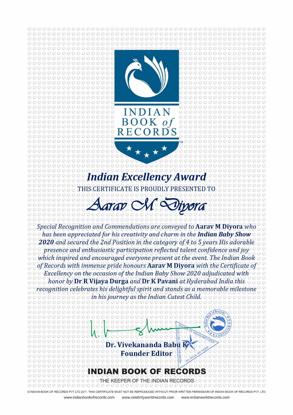 The Indian Book of Records with immense pride honours Aarav M Diyora with the Certificate of Excellency on the occasion of the Indian Baby Show 2020 adjudicated with honor by Dr R Vijaya Durga and Dr K Pavani at Hyderabad India this recognition celebrates his delightful spirit and stands as a memorable milestone in his journey as the Indian Cutest Child,