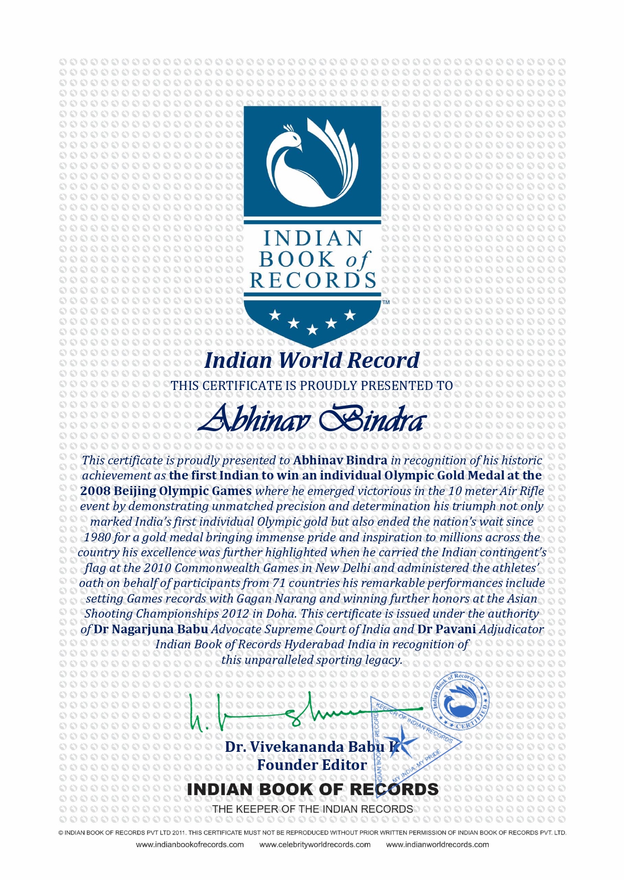 This certificate is proudly presented to Abhinav Bindra in recognition of his historic achievement as the first Indian to win an individual Olympic Gold Medal at the 2008 Beijing Olympic Games where he emerged victorious in the 10 meter Air Rifle event by demonstrating unmatched precision and determination his triumph not only marked India’s first individual Olympic gold but also ended the nation’s wait since 1980 for a gold medal bringing immense pride and inspiration to millions across the country his excellence was further highlighted when he carried the Indian contingent’s flag at the 2010 Commonwealth Games in New Delhi and administered the athletes’ oath on behalf of participants from 71 countries his remarkable performances include setting Games records with Gagan Narang and winning further honors at the Asian Shooting Championships 2012 in Doha.