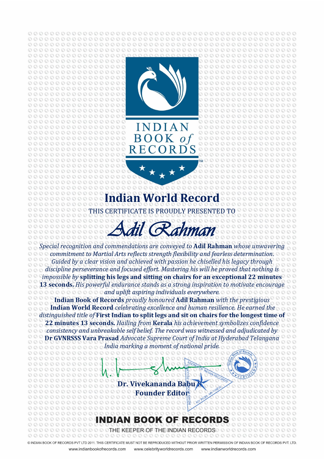 Special recognition and commendations are conveyed to Adil Rahman whose unwavering commitment to Martial Arts reflects strength flexibility and fearless determination Guided by a clear vision and achieved with passion he chiselled his legacy through discipline perseverance and focused effort Mastering his will he proved that nothing is impossible by splitting his legs and sitting on chairs for an exceptional 22 minutes 13 seconds His powerful endurance stands as a strong inspiration to motivate encourage and uplift aspiring individuals everywhere.