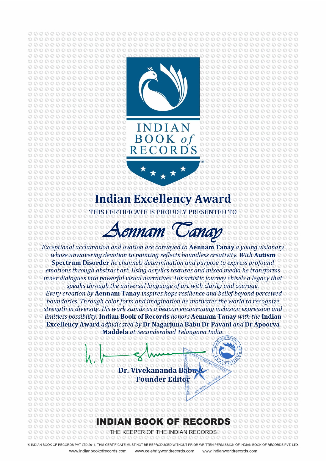 Every creation by Tanay inspires hope resilience and belief beyond perceived boundaries Through color form and imagination he motivates the world to recognize strength in diversity His work stands as a beacon encouraging inclusion expression and limitless possibility Indian Book of Records honors Aennam Tanay with the Indian Excellency Award adjudicated by Dr Nagarjuna Babu Dr Pavani and Dr Apoorva Maddela at Secunderabad Telangana India.