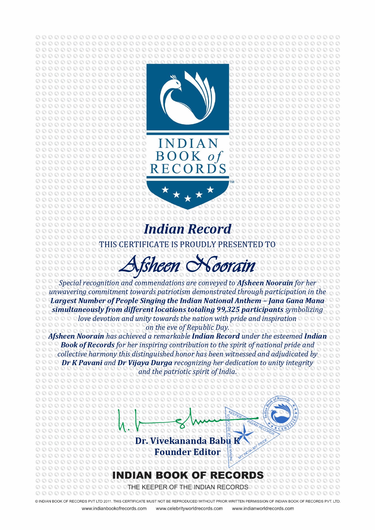 Special recognition and commendations are conveyed to Afsheen Noorain for her unwavering commitment towards patriotism demonstrated through participation in the Largest Number of People Singing the Indian National Anthem – Jana Gana Mana simultaneously from different locations totaling 99,325 participants symbolizing love devotion and unity towards the nation with pride and inspiration on the eve of Republic Day.