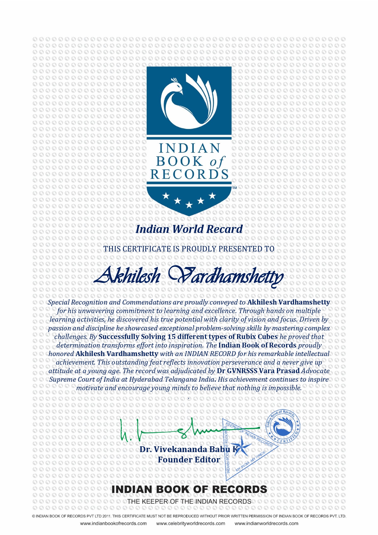 The Indian Book of Records proudly honored Akhilesh Vardhamshetty with an INDIAN RECORD for his remarkable intellectual achievement This outstanding feat reflects innovation perseverance and a never give up attitude at a young age The record was adjudicated by Dr GVNRSSS Vara Prasad Advocate Supreme Court of India at Hyderabad Telangana India His achievement continues to inspire motivate and encourage young minds to believe that nothing is impossible.