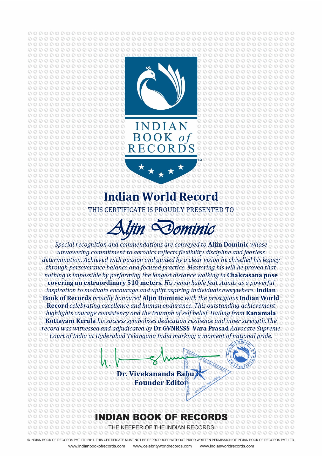 Indian Book of Records proudly honoured Aljin Dominic with the prestigious Indian World Record celebrating excellence and human endurance This outstanding achievement highlights courage consistency and the triumph of self belief Hailing from Kanamala Kottayam Kerala his success symbolizes dedication resilience and inner strength The record was witnessed and adjudicated by Dr GVNRSSS Vara Prasad Advocate Supreme Court of India at Hyderabad Telangana India marking a moment of national pride.