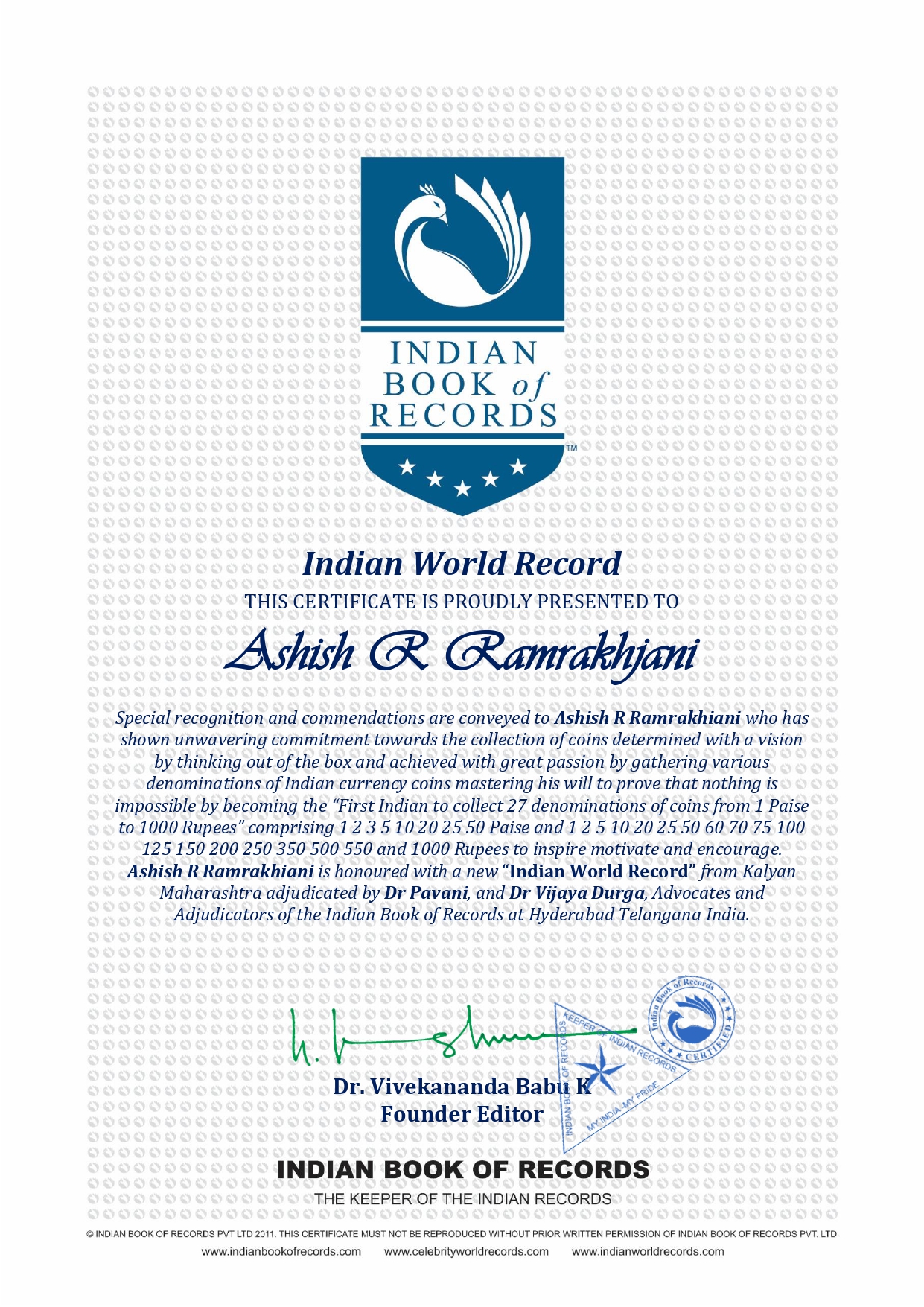 Special recognition and commendations are conveyed to Ashish R Ramrakhiani who has shown unwavering commitment towards the collection of coins determined with a vision by thinking out of the box and achieved with great passion by gathering various denominations of Indian currency coins mastering his will to prove that nothing is impossible by becoming the “First Indian to collect 27 denominations of coins from 1 Paise to 1000 Rupees” comprising 1 2 3 5 10 20 25 50 Paise and 1 2 5 10 20 25 50 60 70 75 100 125 150 200 250 350 500 550 and 1000 Rupees to inspire motivate and encourage.