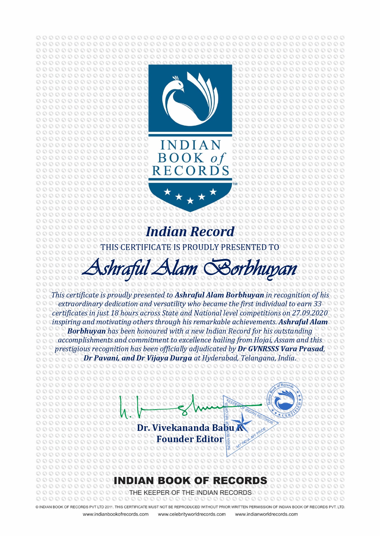 This certificate is proudly presented to Ashraful Alam Borbhuyan in recognition of his extraordinary dedication and versatility who became the first individual to earn 33 certificates in just 18 hours across State and National level competitions on 27.09.2020 inspiring and motivating others through his remarkable achievements.