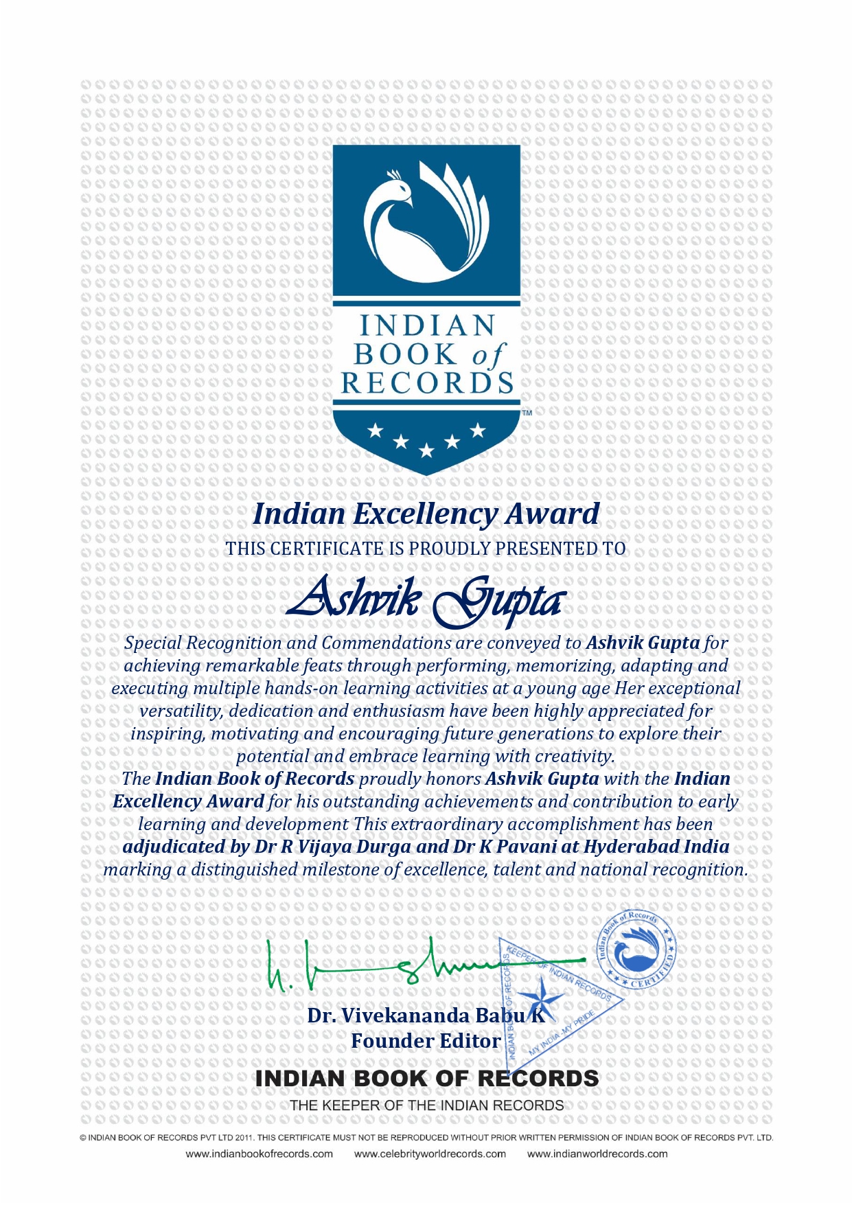 The Indian Book of Records proudly honors Ashvik Gupta with the Indian Excellency Award for his outstanding achievements and contribution to early learning and development This extraordinary accomplishment has been adjudicated by Dr R Vijaya Durga and Dr K Pavani at Hyderabad India marking a distinguished milestone of excellence, talent and national recognition.