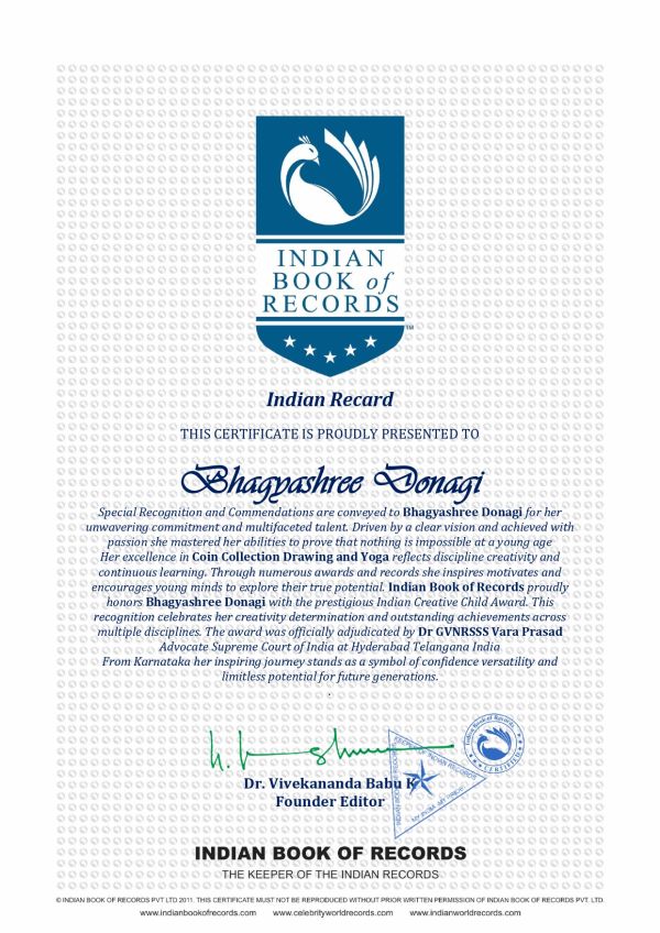 Special Recognition and Commendations are conveyed to Bhagyashree Donagi for her unwavering commitment and multifaceted talent Driven by a clear vision and achieved with passion she mastered her abilities to prove that nothing is impossible at a young age Her excellence in coin collection drawing and yoga reflects discipline creativity and continuous learning Through numerous awards and records she inspires motivates and encourages young minds to explore their true potential.