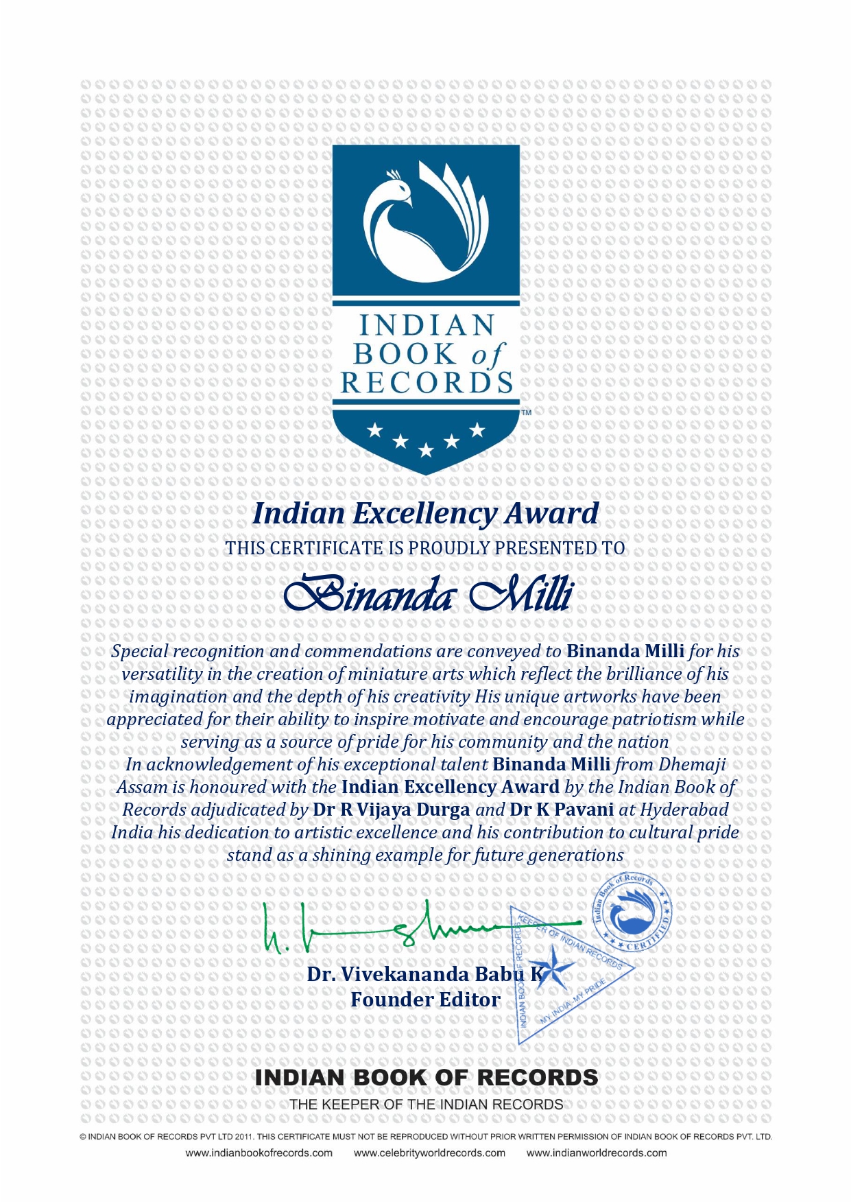 In acknowledgement of his exceptional talent Binanda Milli from Dhemaji Assam is honoured with the Indian Excellency Award by the Indian Book of Records adjudicated by Dr R Vijaya Durga and Dr K Pavani at Hyderabad India his dedication to artistic excellence and his contribution to cultural pride stand as a shining example for future generations.