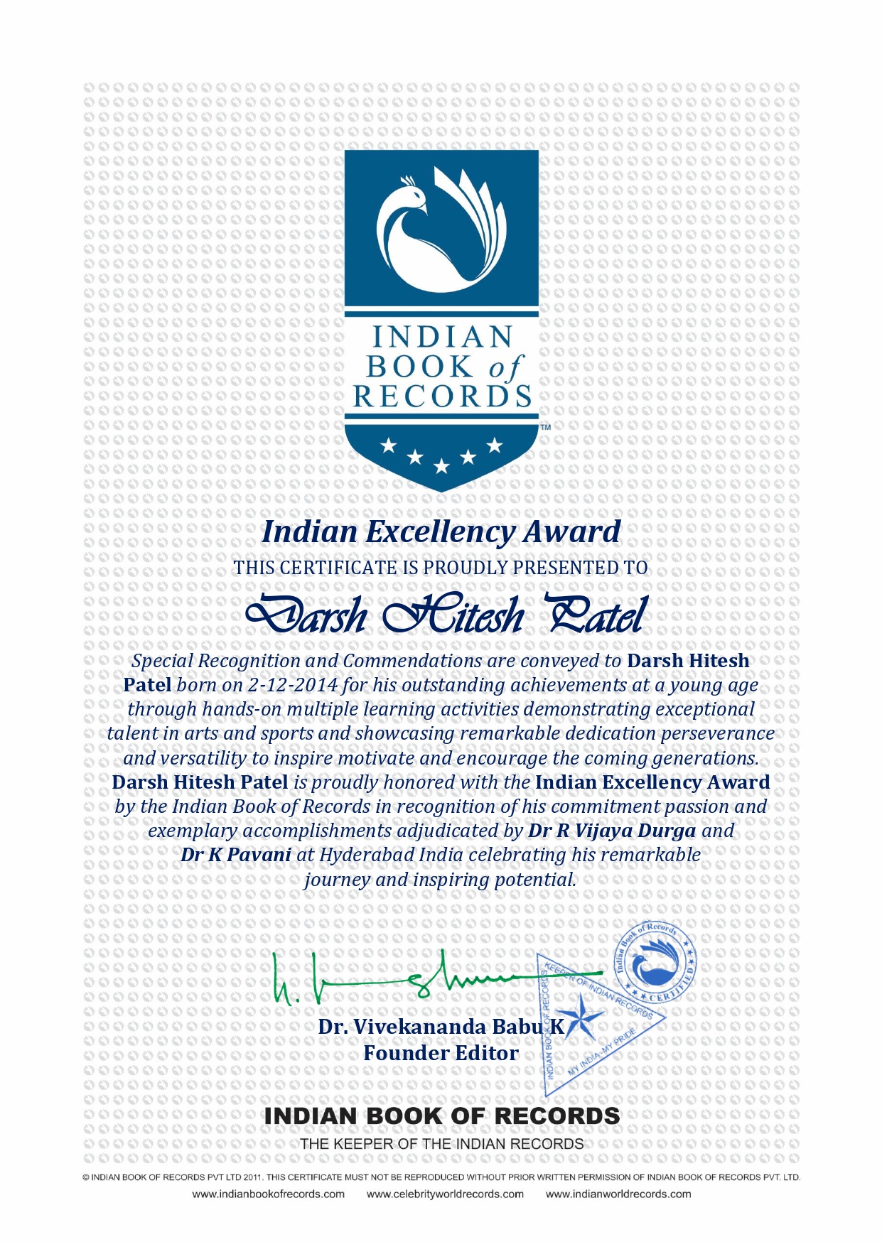 Darsh Hitesh Patel is proudly honored with the Indian Excellency Award by the Indian Book of Records in recognition of his commitment passion and exemplary accomplishments adjudicated by Dr R Vijaya Durga and Dr K Pavani at Hyderabad India celebrating his remarkable journey and inspiring potential.