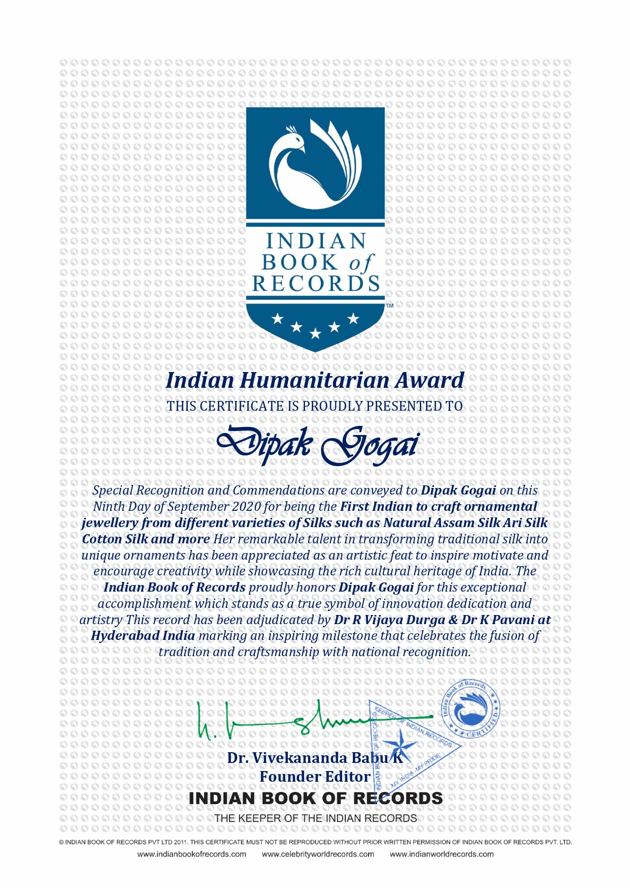 Special Recognition and Commendations are conveyed to Dipak Gogai on this Ninth Day of September 2020 for being the First Indian to craft ornamental jewellery from different varieties of Silks such as Natural Assam Silk Ari Silk Cotton Silk and more Her remarkable talent in transforming traditional silk into unique ornaments has been appreciated as an artistic feat to inspire motivate and encourage creativity while showcasing the rich cultural heritage of India.
