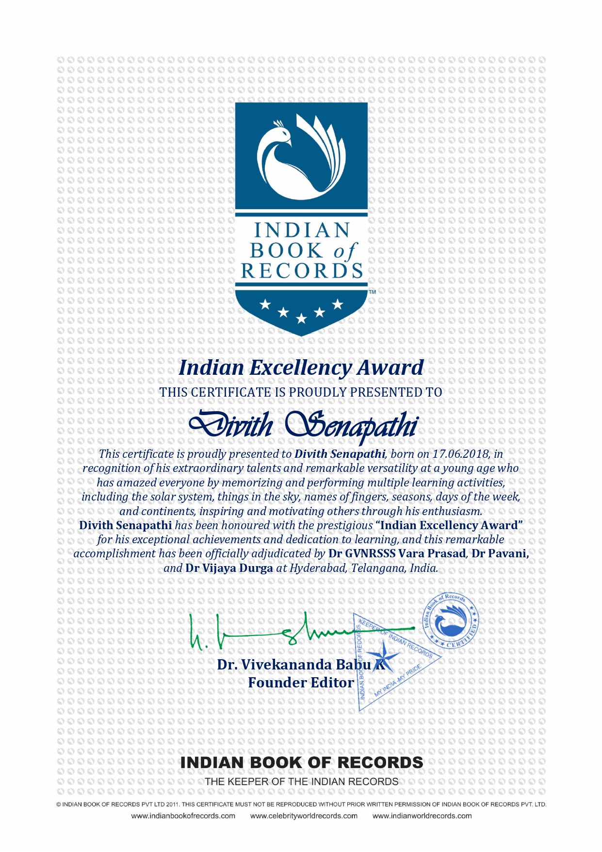 This certificate is proudly presented to Divith Senapathi, born on 17.06.2018, in recognition of his extraordinary talents and remarkable versatility at a young age who has amazed everyone by memorizing and performing multiple learning activities, including the solar system, things in the sky, names of fingers, seasons, days of the week, and continents, inspiring and motivating others through his enthusiasm.