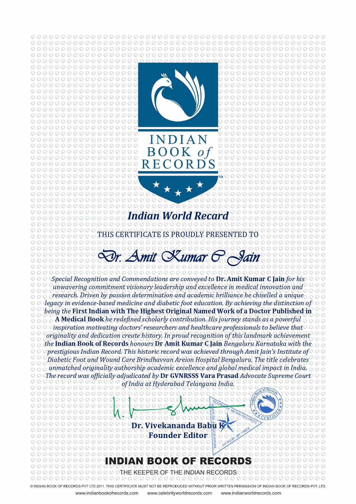 In proud recognition of this landmark achievement the Indian Book of Records honours Dr Amit Kumar C Jain Bengaluru Karnataka with the prestigious Indian Record This historic record was achieved through Amit Jain’s Institute of Diabetic Foot and Wound Care Brindhavvan Areion Hospital Bengaluru The title celebrates unmatched originality authorship academic excellence and global medical impact in India The record was officially adjudicated by Dr GVNRSSS Vara Prasad Advocate Supreme Court of India at Hyderabad Telangana India.