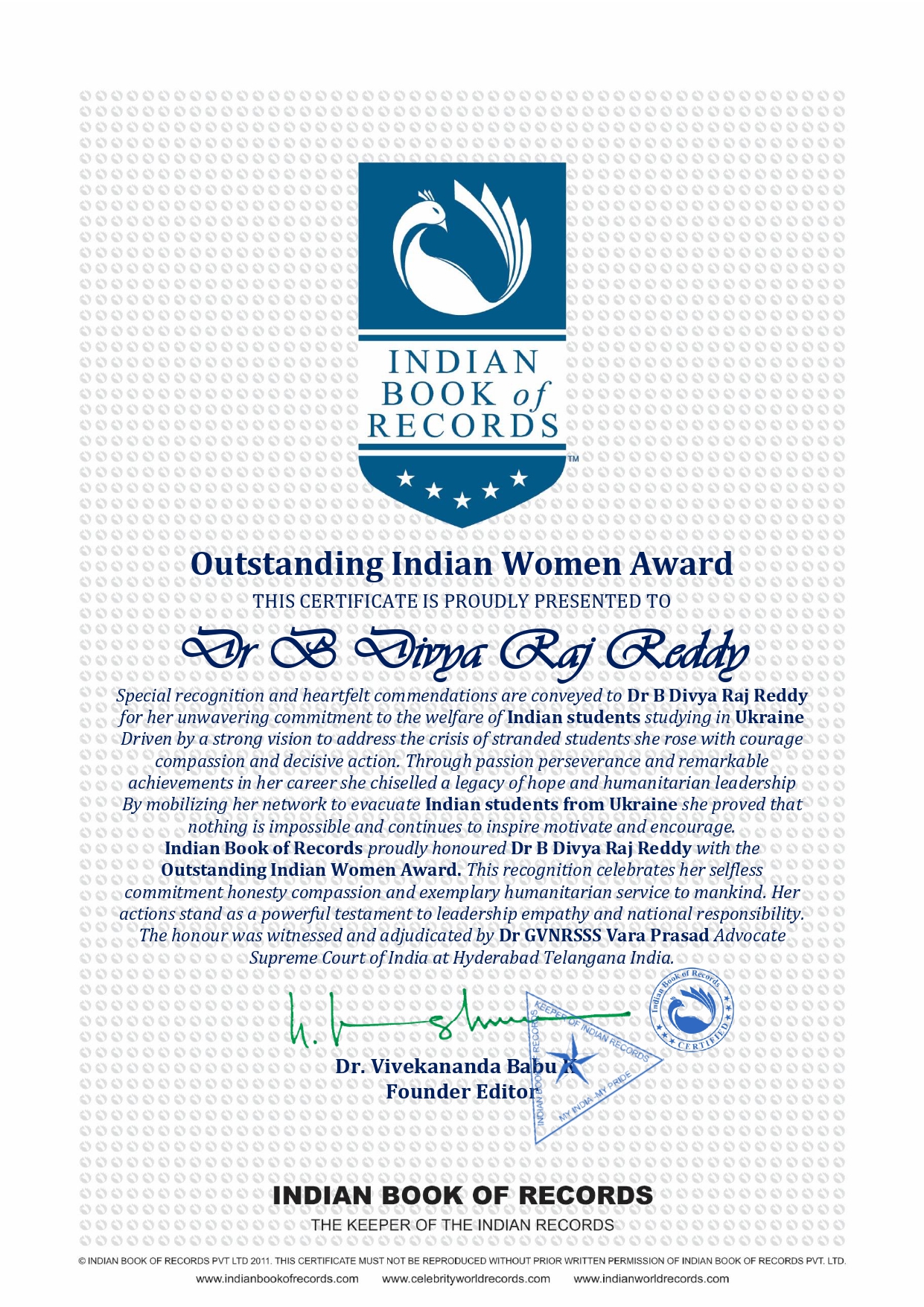 Indian Book of Records proudly honoured Dr B Divya Raj Reddy with the Outstanding Indian Women Award This recognition celebrates her selfless commitment honesty compassion and exemplary humanitarian service to mankind Her actions stand as a powerful testament to leadership empathy and national responsibility The honour was witnessed and adjudicated by Dr GVNRSSS Vara Prasad Advocate Supreme Court of India at Hyderabad Telangana India.