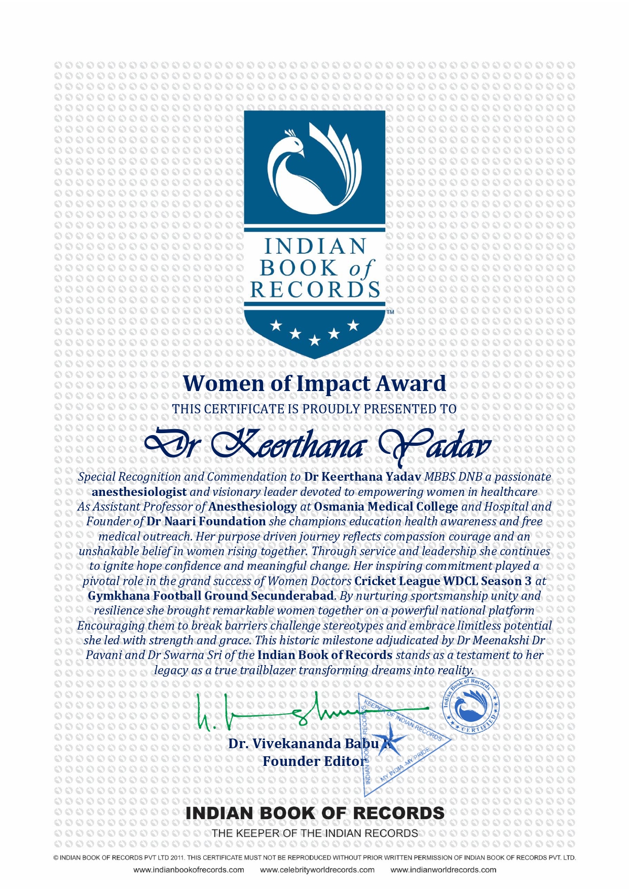 Her inspiring commitment played a pivotal role in the grand success of Women Doctors Cricket League WDCL Season 3 at Gymkhana Football Ground Secunderabad By nurturing sportsmanship unity and resilience she brought remarkable women together on a powerful national platform Encouraging them to break barriers challenge stereotypes and embrace limitless potential she led with strength and grace This historic milestone adjudicated by Dr Meenakshi Dr Pavani and Dr Swarna Sri of the Indian Book of Records stands as a testament to her legacy as a true trailblazer transforming dreams into reality.
