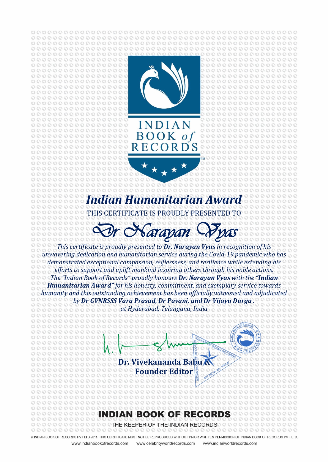 The “Indian Book of Records” proudly honours Dr. Narayan Vyas with the “Indian Humanitarian Award” for his honesty, commitment, and exemplary service towards humanity and this outstanding achievement has been officially witnessed and adjudicated by Dr GVNRSSS Vara Prasad, Dr Pavani, and Dr Vijaya Durga at Hyderabad, Telangana, India.