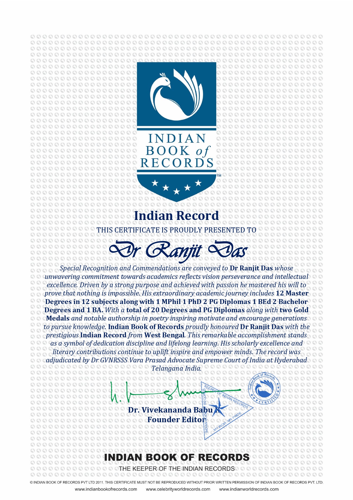 Indian Book of Records proudly honoured Dr Ranjit Das with the prestigious Indian Record from West Bengal This remarkable accomplishment stands as a symbol of dedication discipline and lifelong learning His scholarly excellence and literary contributions continue to uplift inspire and empower minds The record was adjudicated by Dr GVNRSSS Vara Prasad Advocate Supreme Court of India at Hyderabad Telangana India.