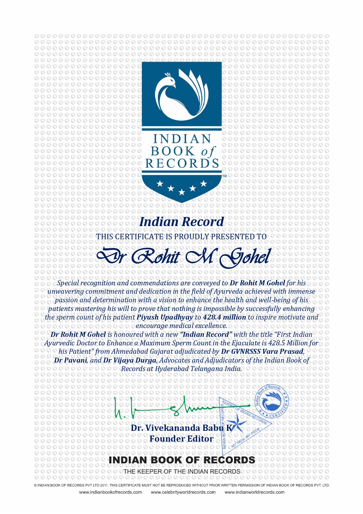 Dr Rohit M Gohel is honoured with a new “Indian Record” with the title “First Indian Ayurvedic Doctor to Enhance a Maximum Sperm Count in the Ejaculate is 428.5 Million for his Patient” from Ahmedabad Gujarat adjudicated by Dr GVNRSSS Vara Prasad, Dr Pavani, and Dr Vijaya Durga, Advocates and Adjudicators of the Indian Book of Records at Hyderabad Telangana India.