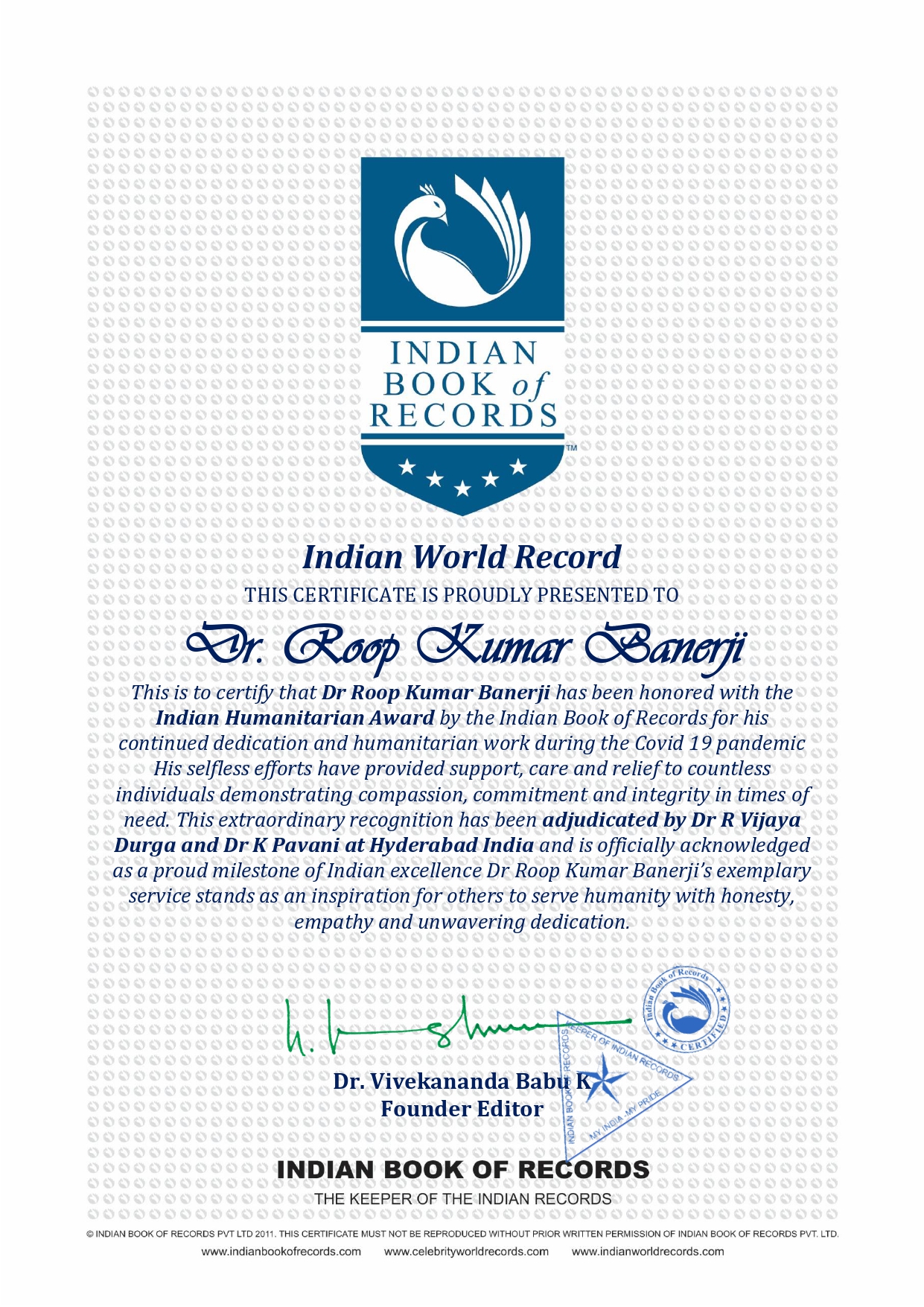 This is to certify that Dr Roop Kumar Banerji has been honored with the Indian Humanitarian Award by the Indian Book of Records for his continued dedication and humanitarian work during the Covid 19 pandemic His selfless efforts have provided support, care and relief to countless individuals demonstrating compassion, commitment and integrity in times of need.