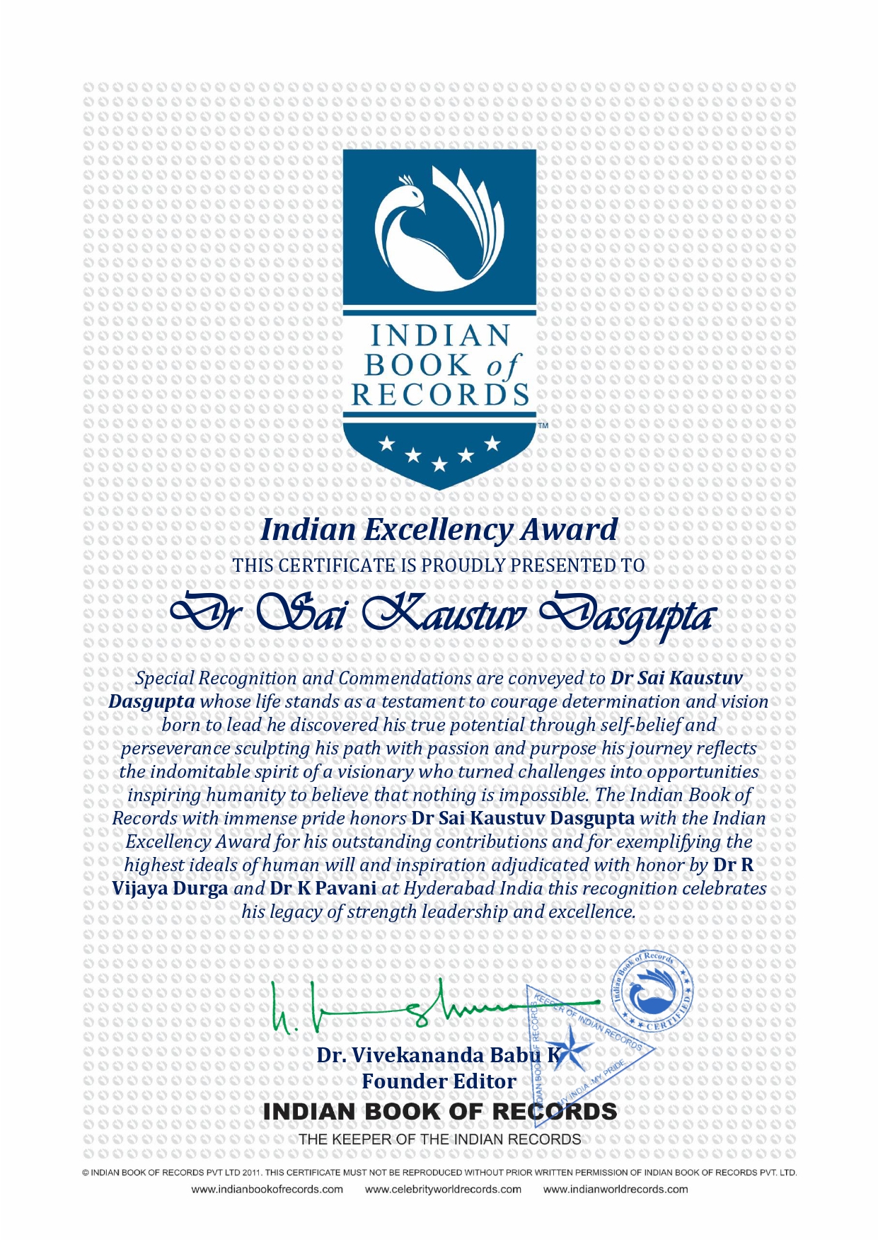 The Indian Book of Records with immense pride honors Dr Sai Kaustuv Dasgupta with the Indian Excellency Award for his outstanding contributions and for exemplifying the highest ideals of human will and inspiration adjudicated with honor by Dr R Vijaya Durga and Dr K Pavani at Hyderabad India this recognition celebrates his legacy of strength leadership and excellence.