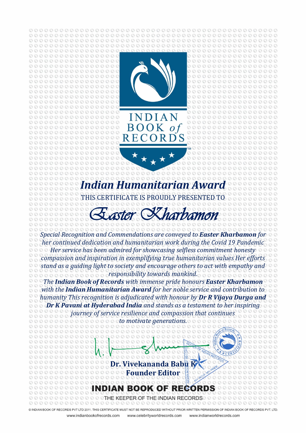 The Indian Book of Records with immense pride honours Easter Kharbamon with the Indian Humanitarian Award for her noble service and contribution to humanity This recognition is adjudicated with honour by Dr R Vijaya Durga and Dr K Pavani at Hyderabad India and stands as a testament to her inspiring journey of service resilience and compassion that continues to motivate generations.