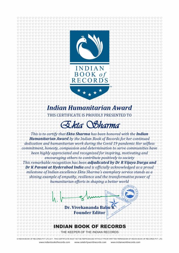 This is to certify that Ekta Sharma has been honored with the Indian Humanitarian Award by the Indian Book of Records for her continued dedication and humanitarian work during the Covid 19 pandemic Her selfless commitment, honesty, compassion and determination to serve communities have been highly appreciated and recognized for inspiring, motivating and encouraging others to contribute positively to society.