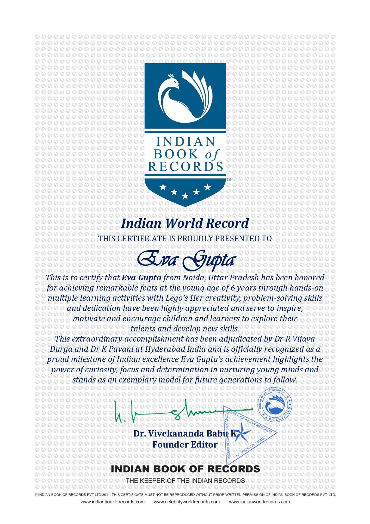 This is to certify that Eva Gupta from Noida, Uttar Pradesh has been honored for achieving remarkable feats at the young age of 6 years through hands-on multiple learning activities with Lego’s Her creativity, problem-solving skills and dedication have been highly appreciated and serve to inspire, motivate and encourage children and learners to explore their talents and develop new skills.