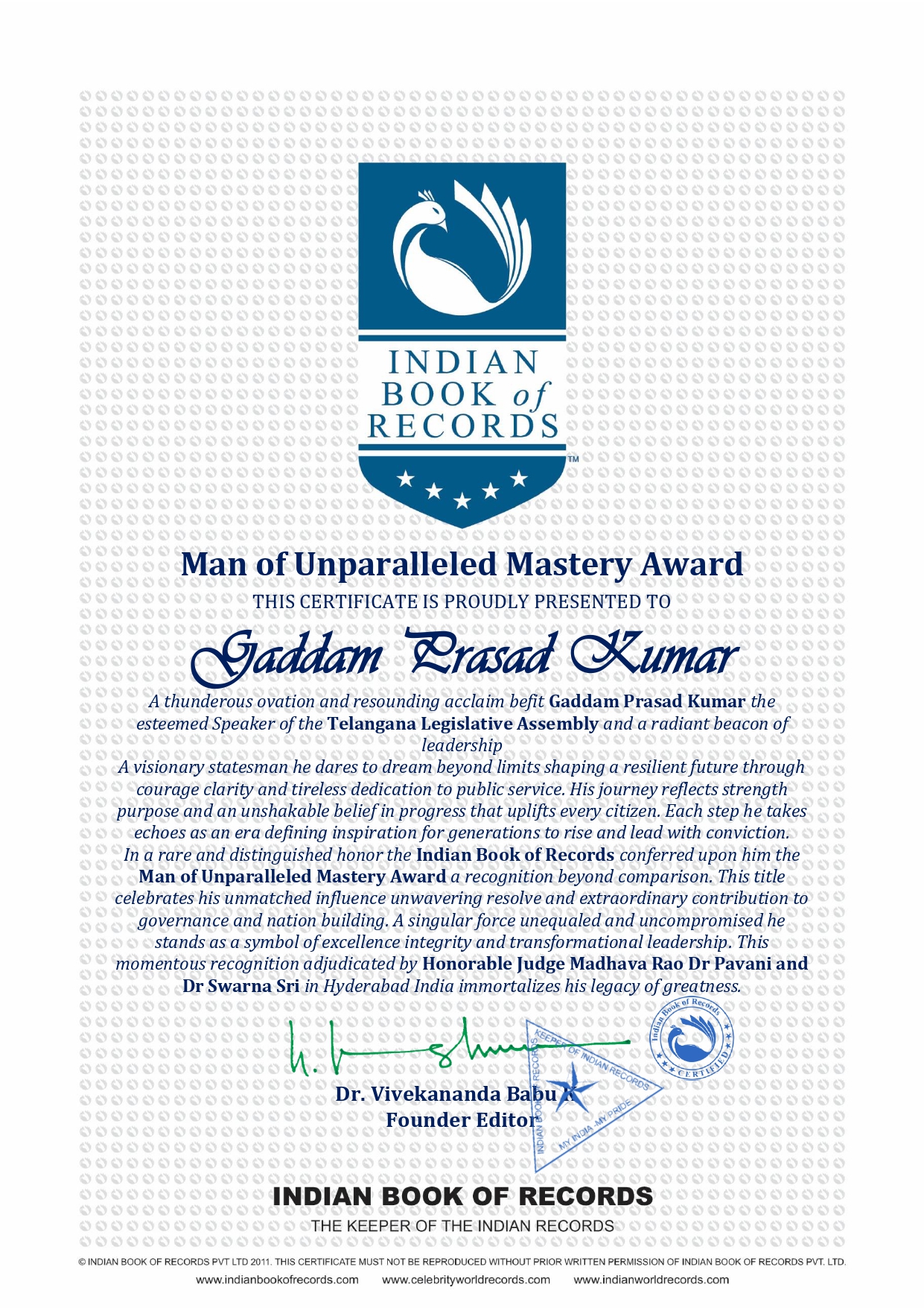 In a rare and distinguished honor the Indian Book of Records conferred upon him the Man of Unparalleled Mastery Award a recognition beyond comparison This title celebrates his unmatched influence unwavering resolve and extraordinary contribution to governance and nation building A singular force unequaled and uncompromised he stands as a symbol of excellence integrity and transformational leadership This momentous recognition adjudicated by Honorable Judge Madhava Rao Dr Pavani and Dr Swarna Sri in Hyderabad India immortalizes his legacy of greatness.