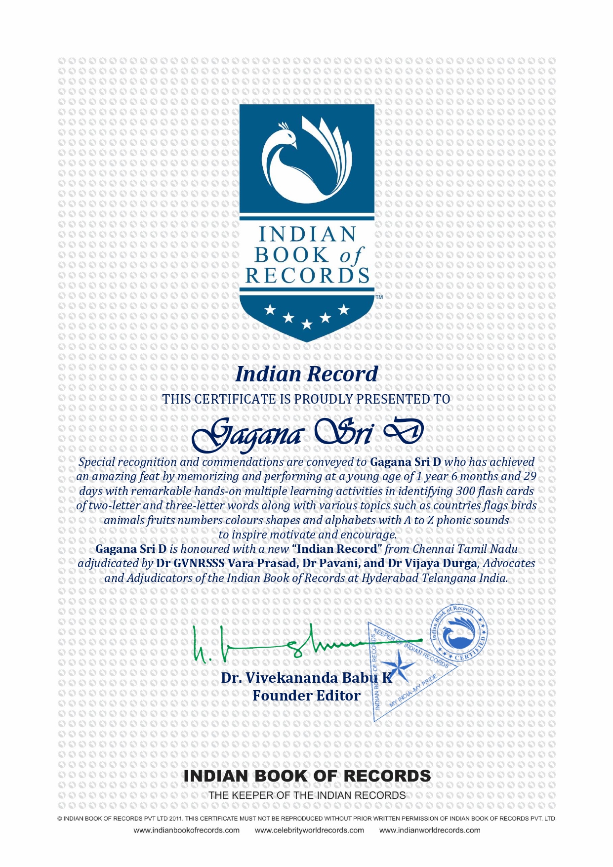Special recognition and commendations are conveyed to Gagana Sri D who has achieved an amazing feat by memorizing and performing at a young age of 1 year 6 months and 29 days with remarkable hands-on multiple learning activities in identifying 300 flash cards of two-letter and three-letter words along with various topics such as countries flags birds animals fruits numbers colours shapes and alphabets with A to Z phonic sounds to inspire motivate and encourage.