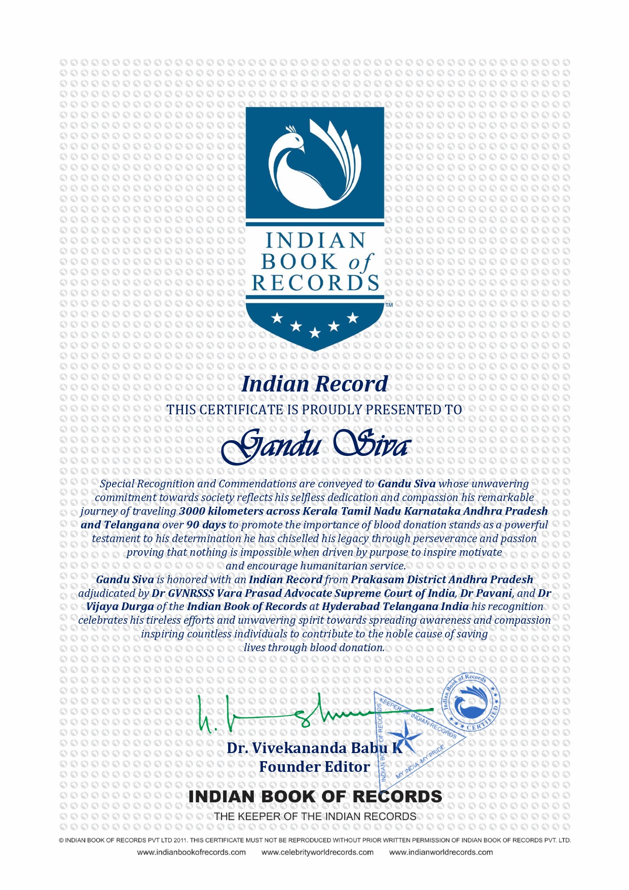 Special Recognition and Commendations are conveyed to Gandu Siva whose unwavering commitment towards society reflects his selfless dedication and compassion his remarkable journey of traveling 3000 kilometers across Kerala Tamil Nadu Karnataka Andhra Pradesh and Telangana over 90 days to promote the importance of blood donation stands as a powerful testament to his determination he has chiseled his legacy through perseverance and passion proving that nothing is impossible when driven by purpose to inspire motivate and encourage humanitarian service.