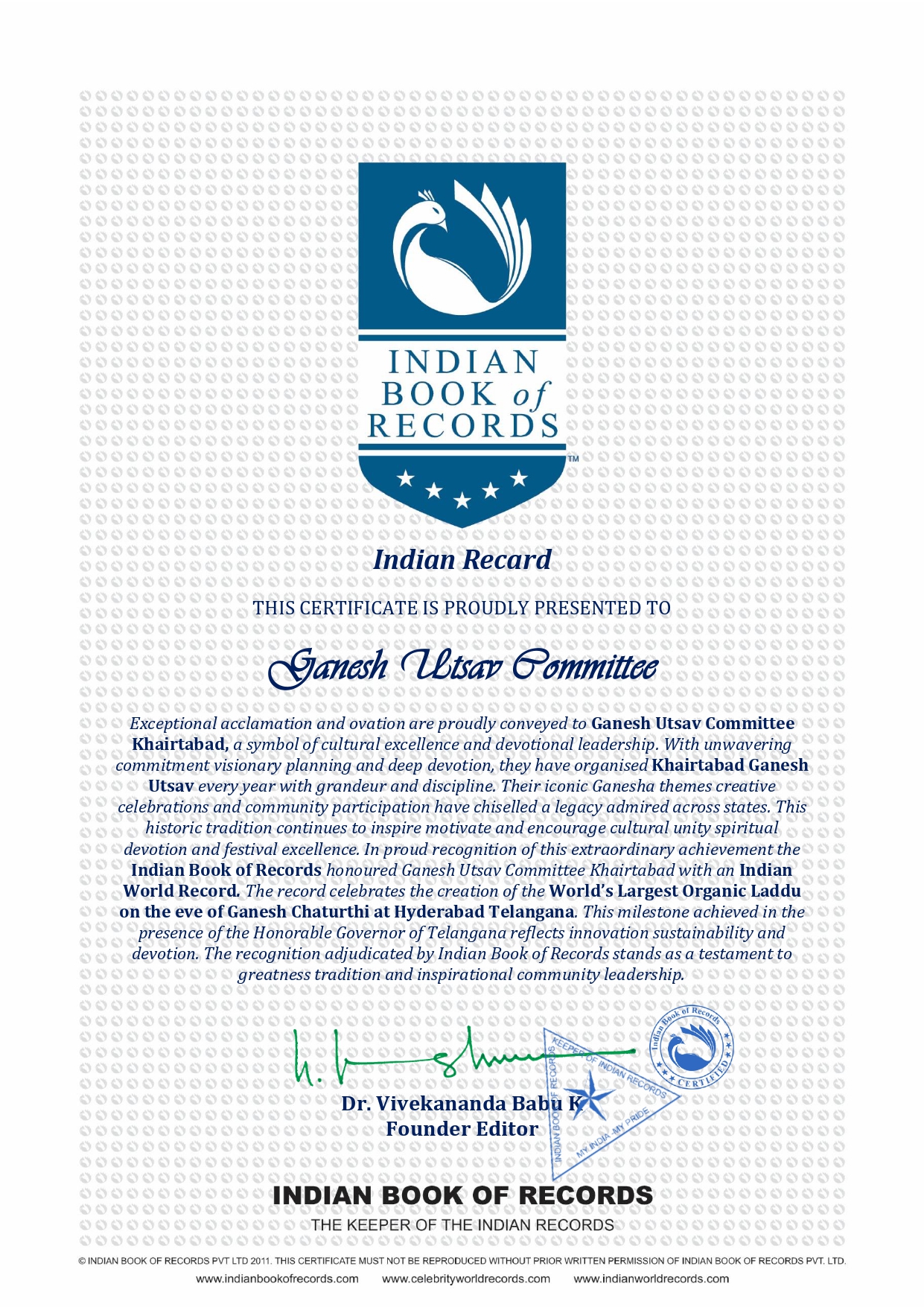 In proud recognition of this extraordinary achievement the Indian Book of Records honoured Ganesh Utsav Committee Khairtabad with an Indian World Record The record celebrates the creation of the World’s Largest Organic Laddu on the eve of Ganesh Chaturthi at Hyderabad Telangana This milestone achieved in the presence of the Honorable Governor of Telangana reflects innovation sustainability and devotion The recognition adjudicated by Indian Book of Records stands as a testament to greatness tradition and inspirational community leadership.