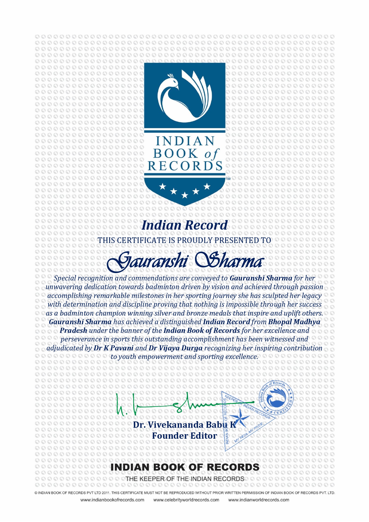 Gauranshi Sharma has achieved a distinguished Indian Record from Bhopal Madhya Pradesh under the banner of the Indian Book of Records for her excellence and perseverance in sports this outstanding accomplishment has been witnessed and adjudicated by Dr K Pavani and Dr Vijaya Durga recognizing her inspiring contribution to youth empowerment and sporting excellence.