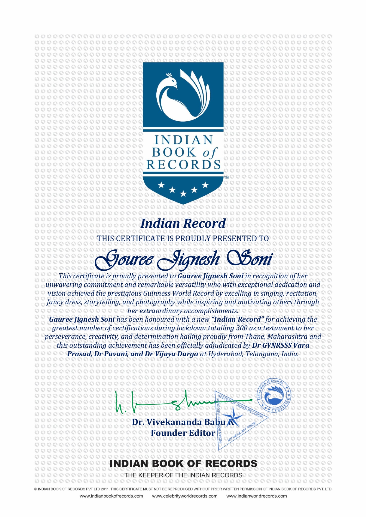 Gauree Jignesh Soni has been honoured with a new “Indian Record” for achieving the greatest number of certifications during lockdown totaling 300 as a testament to her perseverance, creativity, and determination hailing proudly from Thane, Maharashtra and this outstanding achievement has been officially adjudicated by Dr GVNRSSS Vara Prasad, Dr Pavani, and Dr Vijaya Durga at Hyderabad, Telangana, India.