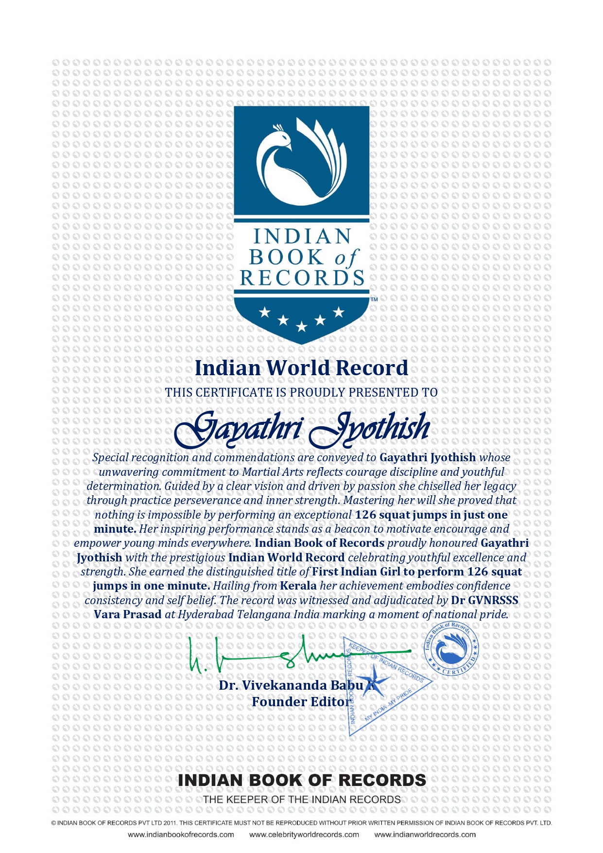 Indian Book of Records proudly honoured Gayathri Jyothish with the prestigious Indian World Record celebrating youthful excellence and strength She earned the distinguished title of First Indian Girl to perform 126 squat jumps in one minute Hailing from Kerala her achievement embodies confidence consistency and self belief The record was witnessed and adjudicated by Dr GVNRSSS Vara Prasad at Hyderabad Telangana India marking a moment of national pride.