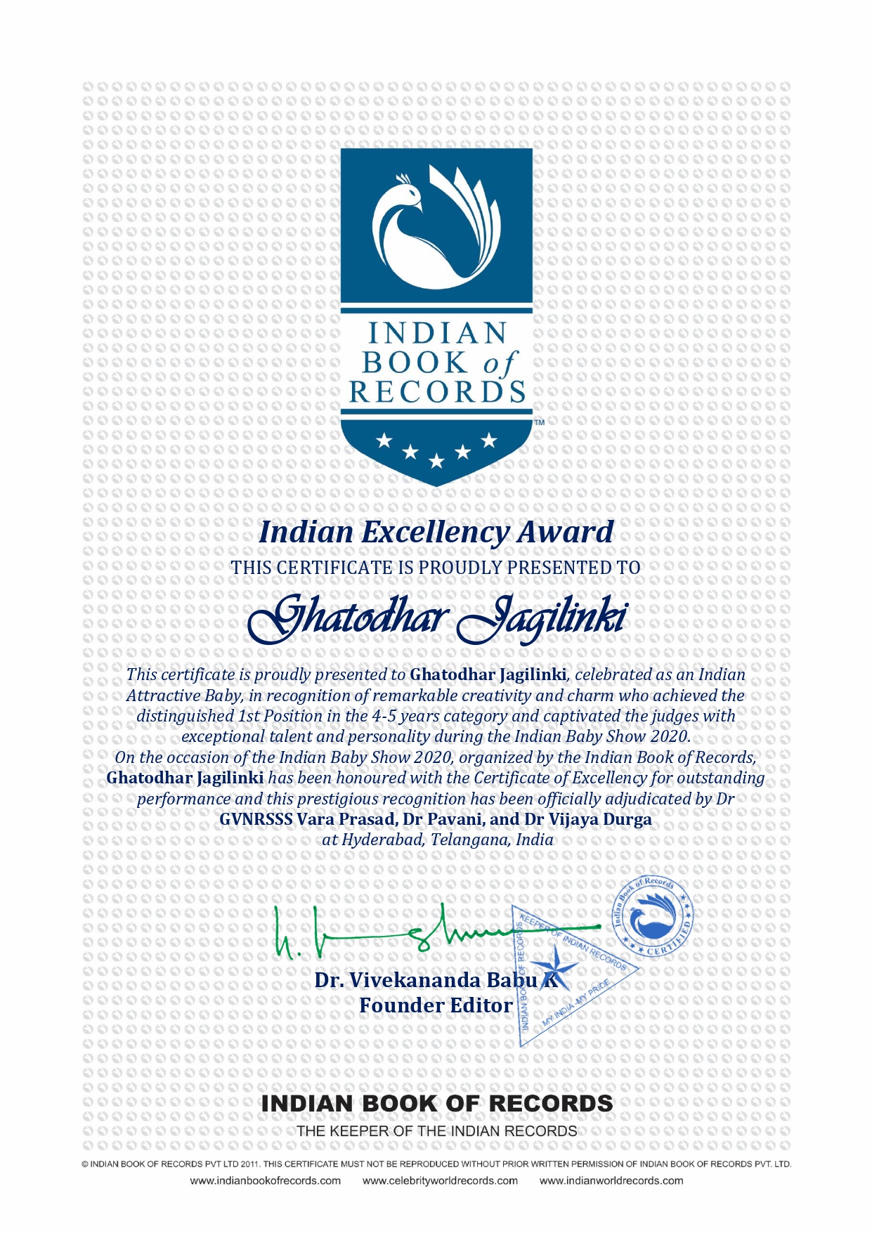 On the occasion of the Indian Baby Show 2020, organized by the Indian Book of Records, Ghatodhar Jagilinki has been honoured with the Certificate of Excellency for outstanding performance and this prestigious recognition has been officially adjudicated by Dr GVNRSSS Vara Prasad, Dr Pavani, and Dr Vijaya Durga at Hyderabad, Telangana, India.