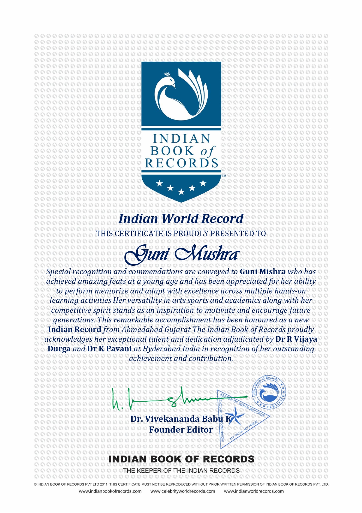 This remarkable accomplishment has been honoured as a new Indian Record from Ahmedabad Gujarat The Indian Book of Records proudly acknowledges her exceptional talent and dedication adjudicated by Dr R Vijaya Durga and Dr K Pavani at Hyderabad India in recognition of her outstanding achievement and contribution.