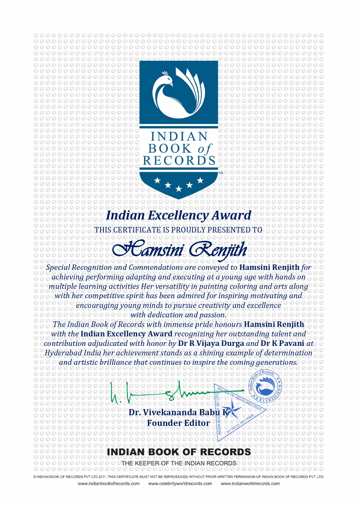 The Indian Book of Records with immense pride honours Hamsini Renjith with the Indian Excellency Award recognizing her outstanding talent and contribution adjudicated with honor by Dr R Vijaya Durga and Dr K Pavani at Hyderabad India her achievement stands as a shining example of determination and artistic brilliance that continues to inspire the coming generations.