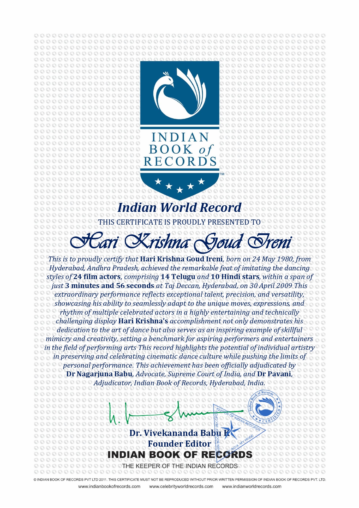 This is to proudly certify that Hari Krishna Goud Ireni, born on 24 May 1980, from Hyderabad, Andhra Pradesh, achieved the remarkable feat of imitating the dancing styles of 24 film actors, comprising 14 Telugu and 10 Hindi stars, within a span of just 3 minutes and 56 seconds at Taj Deccan, Hyderabad, on 30 April 2009 This extraordinary performance reflects exceptional talent, precision, and versatility, showcasing his ability to seamlessly adapt to the unique moves, expressions, and rhythm of multiple celebrated actors in a highly entertaining and technically challenging display Hari Krishna’s accomplishment not only demonstrates his dedication to the art of dance but also serves as an inspiring example of skillful mimicry and creativity, setting a benchmark for aspiring performers and entertainers in the field of performing arts This record highlights the potential of individual artistry in preserving and celebrating cinematic dance culture while pushing the limits of personal performance.