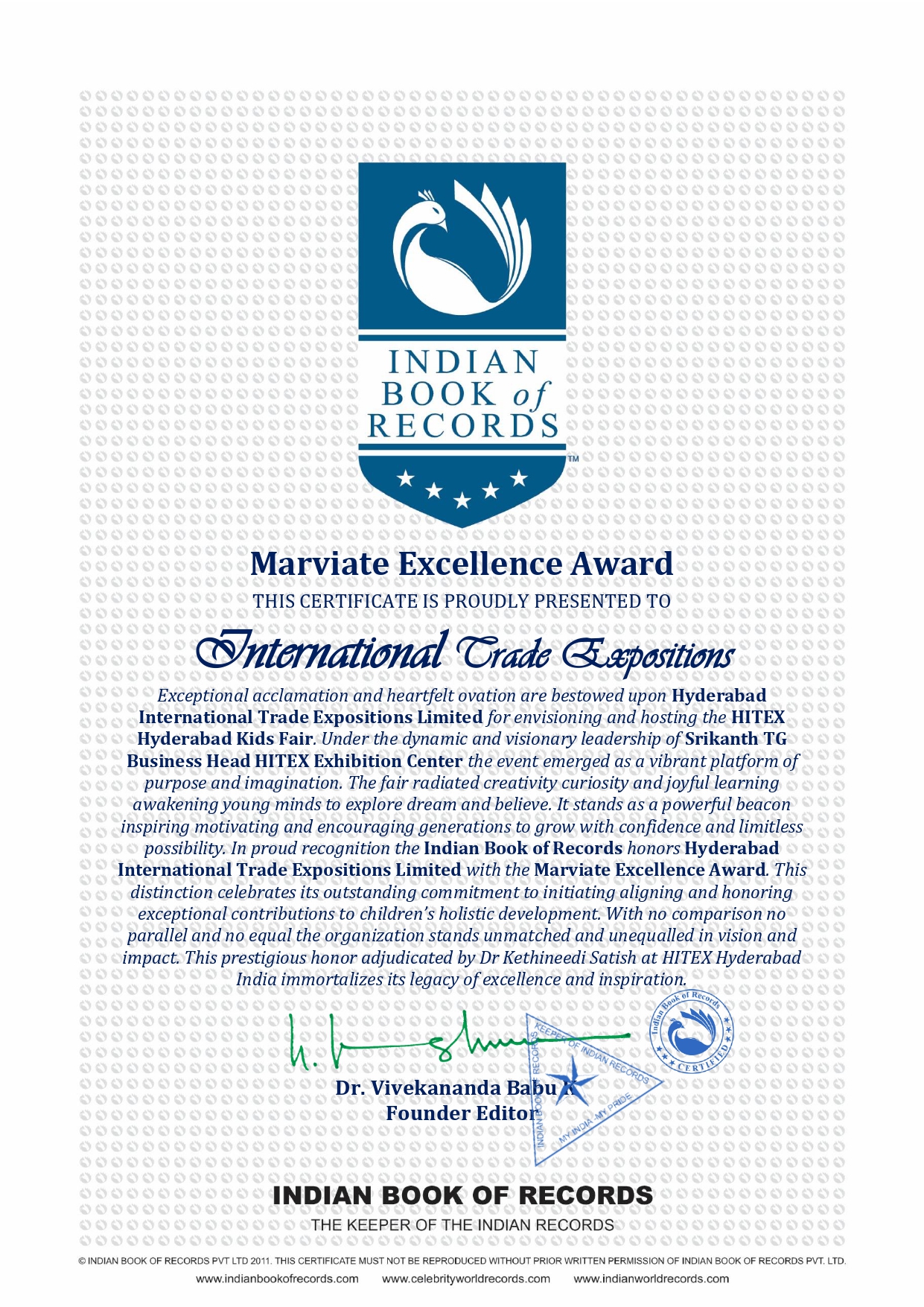 In proud recognition the Indian Book of Records honors Hyderabad International Trade Expositions Limited with the Marviate Excellence Award This distinction celebrates its outstanding commitment to initiating aligning and honoring exceptional contributions to children’s holistic development With no comparison no parallel and no equal the organization stands unmatched and unequalled in vision and impact This prestigious honor adjudicated by Dr Kethineedi Satish at HITEX Hyderabad India immortalizes its legacy of excellence and inspiration.