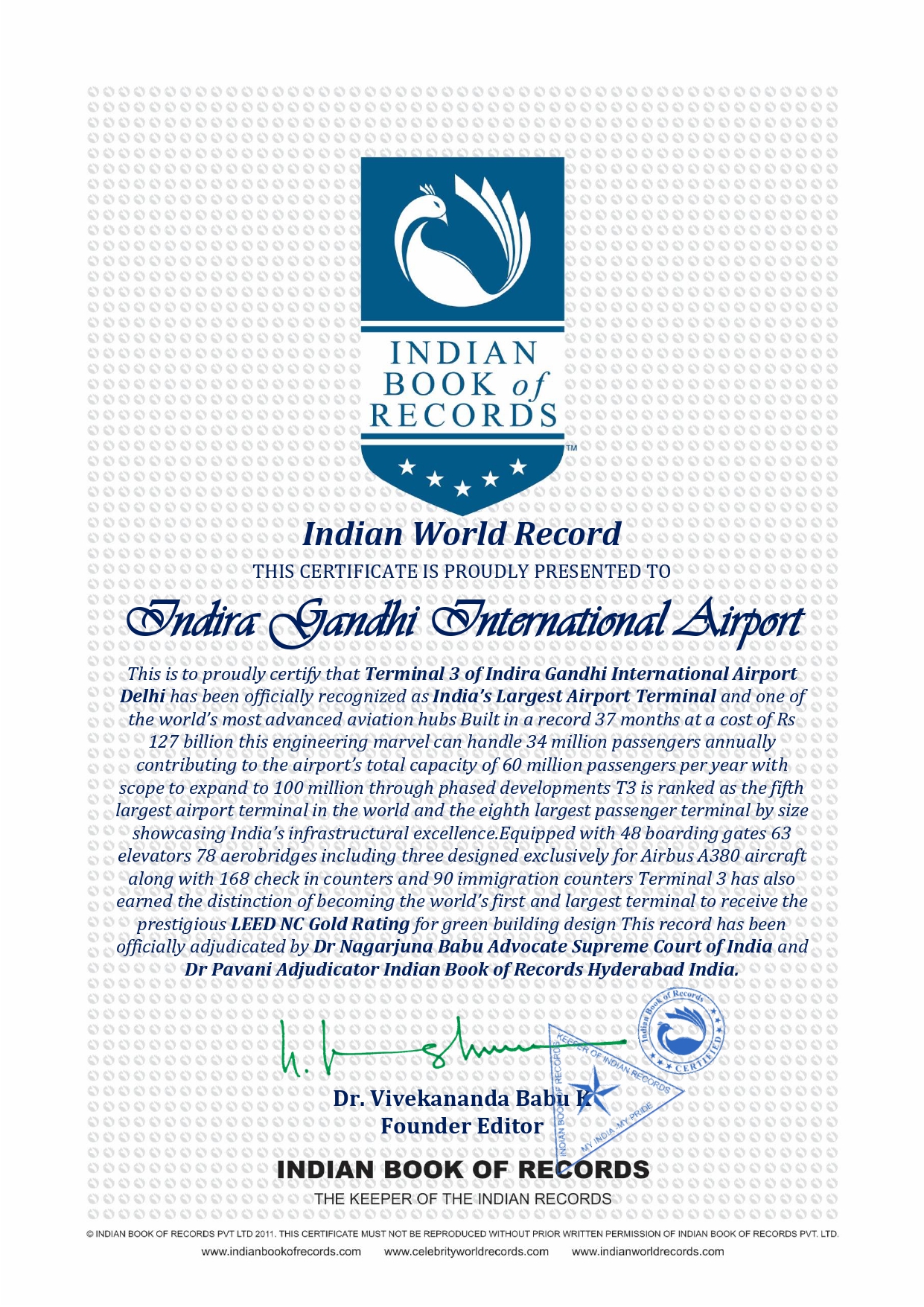 Equipped with 48 boarding gates 63 elevators 78 aerobridges including three designed exclusively for Airbus A380 aircraft along with 168 check in counters and 90 immigration counters Terminal 3 has also earned the distinction of becoming the world’s first and largest terminal to receive the prestigious LEED NC Gold Rating for green building design This record has been officially adjudicated by Dr Nagarjuna Babu Advocate Supreme Court of India and Dr Pavani Adjudicator Indian Book of Records Hyderabad India.