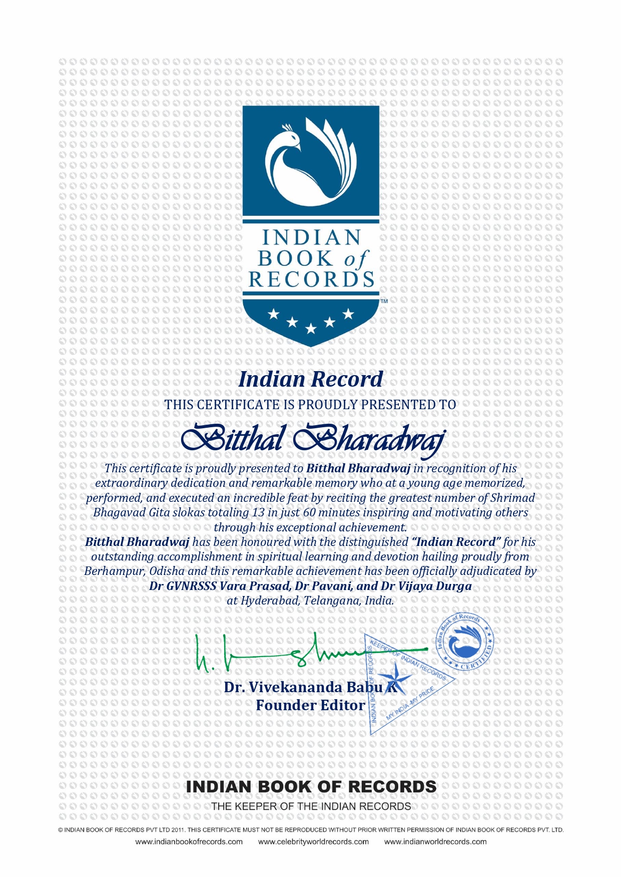 This certificate is proudly presented to Bitthal Bharadwaj in recognition of his extraordinary dedication and remarkable memory who at a young age memorized, performed, and executed an incredible feat by reciting the greatest number of Shrimad Bhagavad Gita slokas totaling 13 in just 60 minutes inspiring and motivating others through his exceptional achievement.