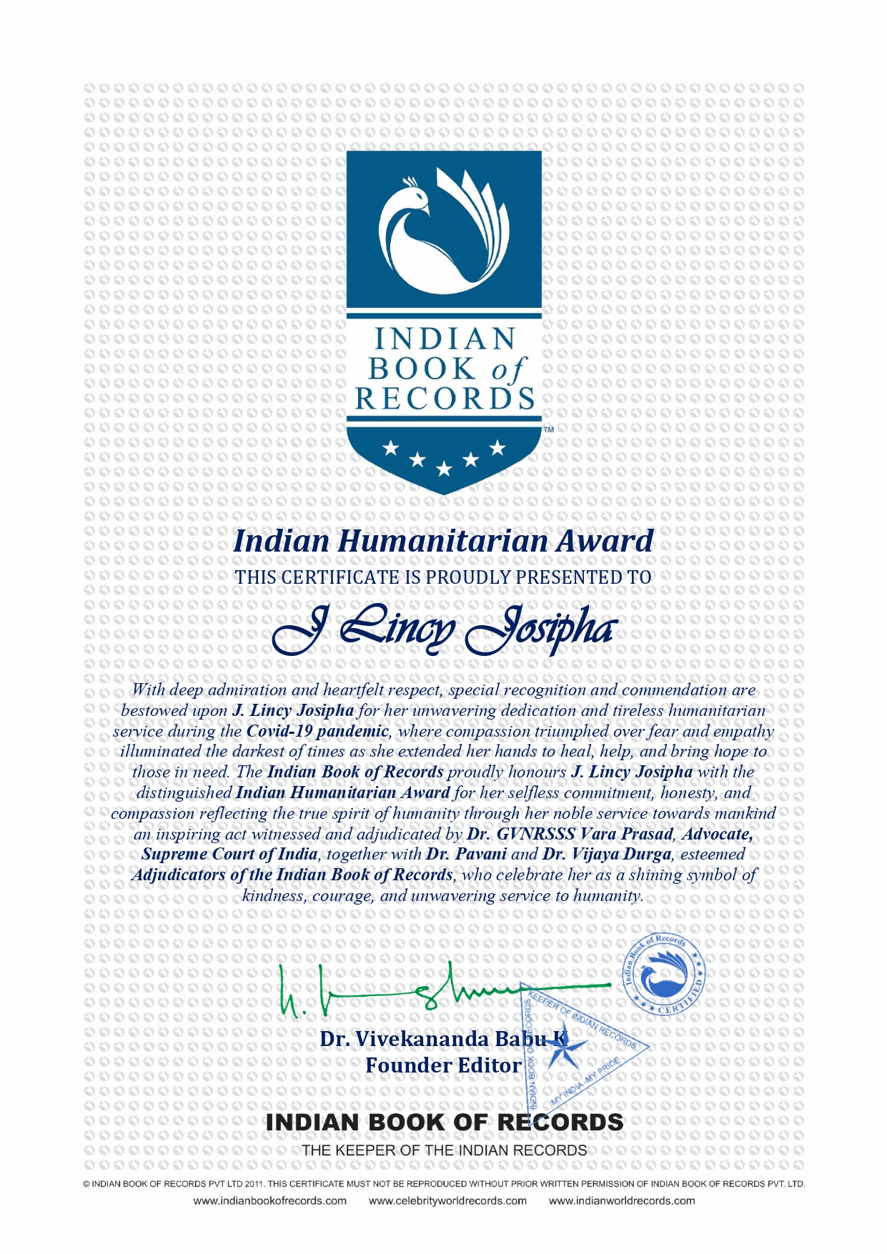 Lincy Josipha with the distinguished Indian Humanitarian Award for her selfless commitment, honesty, and compassion reflecting the true spirit of humanity through her noble service towards mankind an inspiring act witnessed and adjudicated by Dr. GVNRSSS Vara Prasad, Advocate, Supreme Court of India, together with Dr. Pavani and Dr. Vijaya Durga, esteemed Adjudicators of the Indian Book of Records, who celebrate her as a shining symbol of kindness, courage, and unwavering service to humanity.