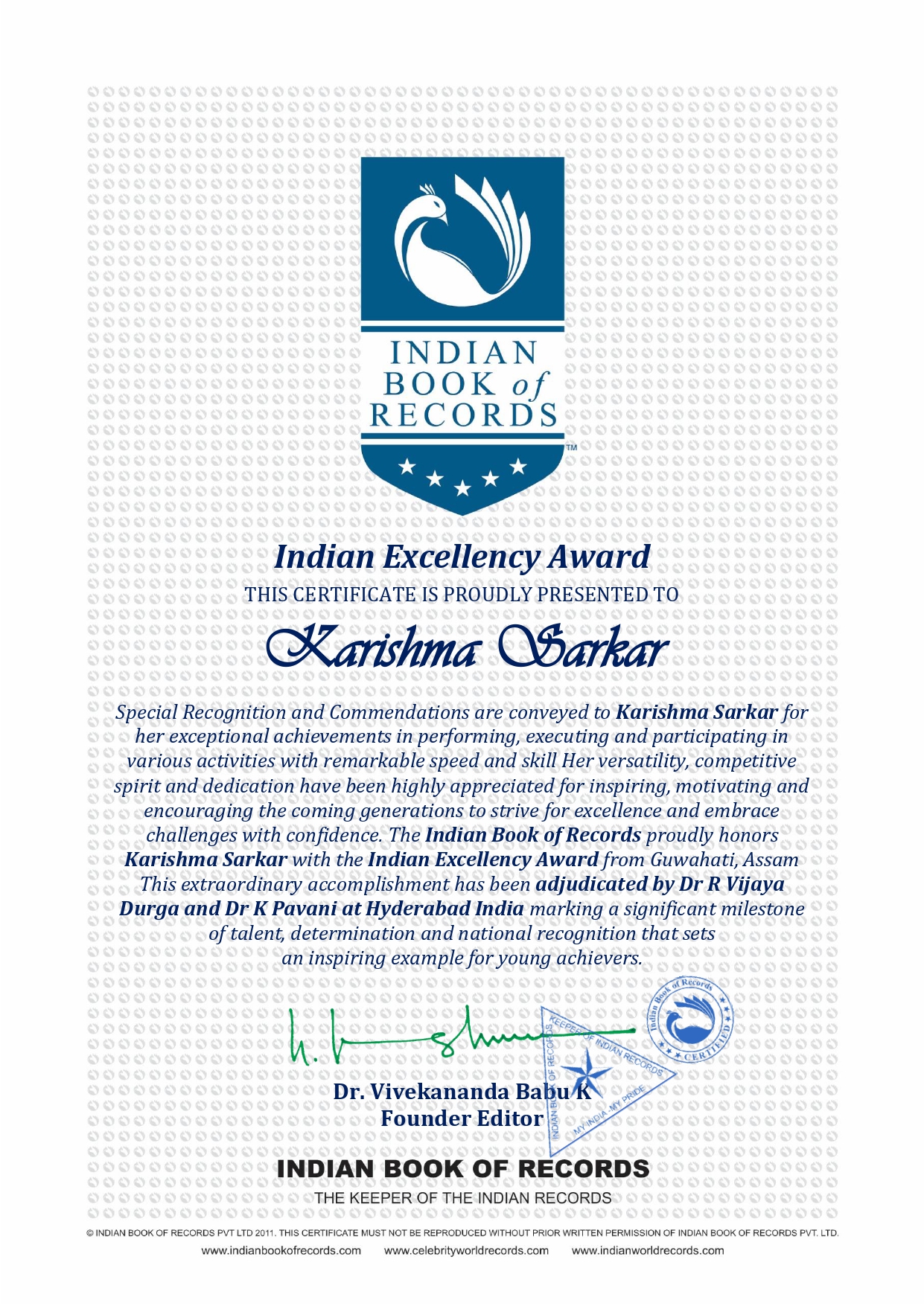 The Indian Book of Records proudly honors Karishma Sarkar with the Indian Excellency Award from Guwahati, Assam This extraordinary accomplishment has been adjudicated by Dr R Vijaya Durga and Dr K Pavani at Hyderabad India marking a significant milestone of talent, determination and national recognition that sets an inspiring example for young achievers.