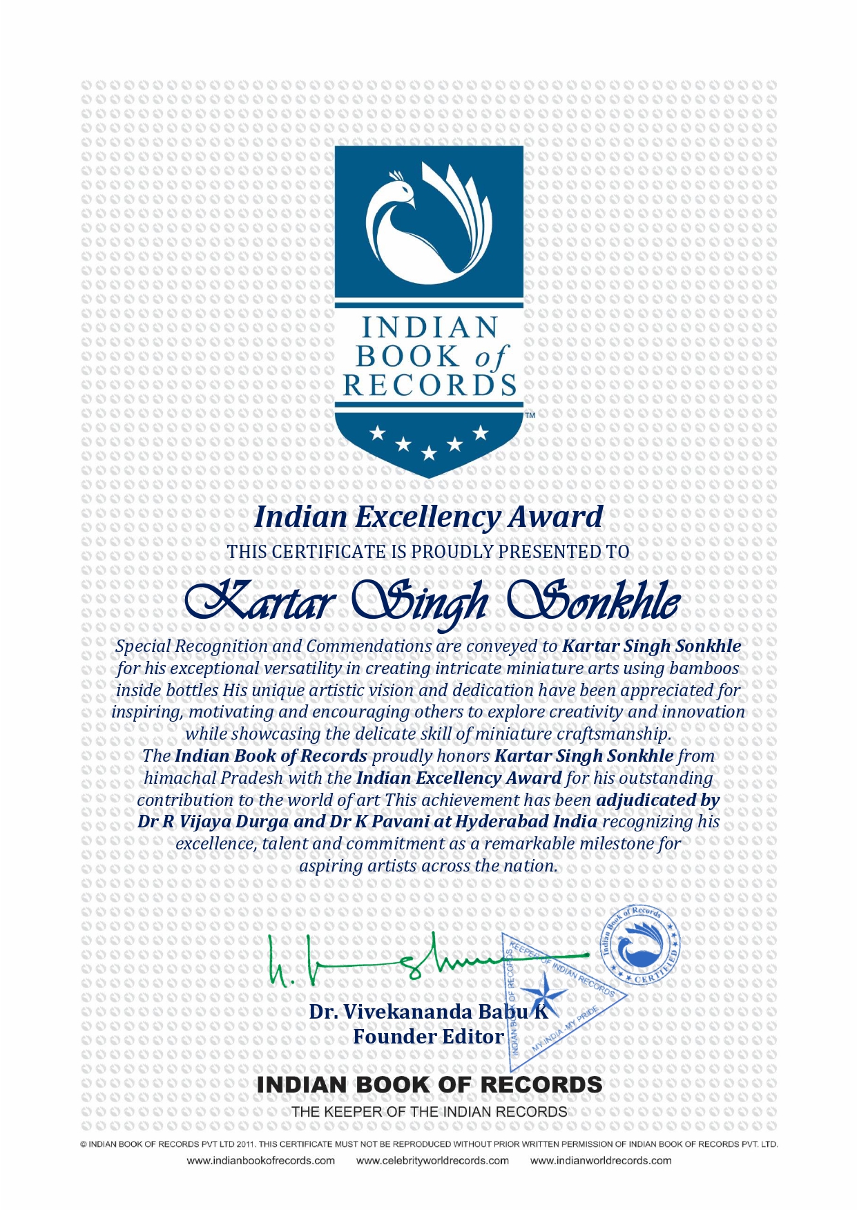 The Indian Book of Records proudly honors Kartar Singh Sonkhle from himachal Pradesh with the Indian Excellency Award for his outstanding contribution to the world of art This achievement has been adjudicated by Dr R Vijaya Durga and Dr K Pavani at Hyderabad India recognizing his excellence, talent and commitment as a remarkable milestone for aspiring artists across the nation.