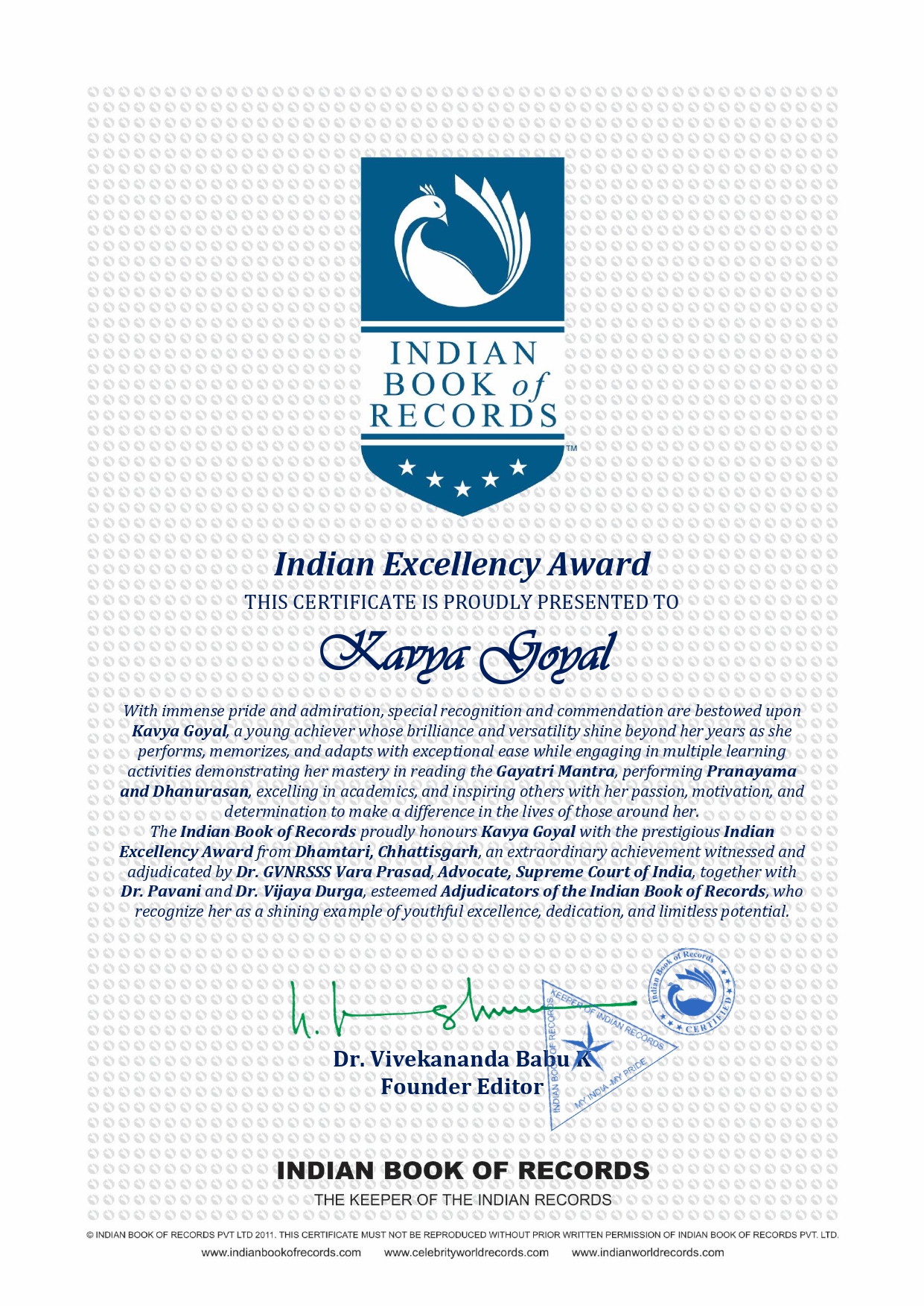 The Indian Book of Records proudly honours Kavya Goyal with the prestigious Indian Excellency Award from Dhamtari, Chhattisgarh, an extraordinary achievement witnessed and adjudicated by Dr. GVNRSSS Vara Prasad, Advocate, Supreme Court of India, together with Dr. Pavani and Dr. Vijaya Durga, esteemed Adjudicators of the Indian Book of Records, who recognize her as a shining example of youthful excellence, dedication, and limitless potential.
