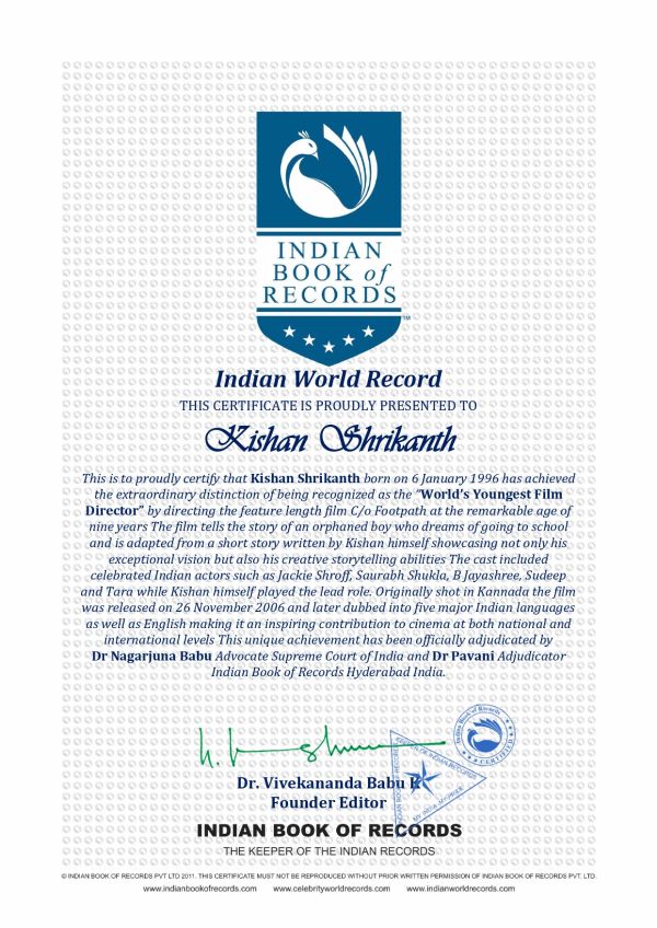 This is to proudly certify that Kishan Shrikanth born on 6 January 1996 has achieved the extraordinary distinction of being recognized as the World’s Youngest Film Director by directing the feature length film C/o Footpath at the remarkable age of nine years The film tells the story of an orphaned boy who dreams of going to school and is adapted from a short story written by Kishan himself showcasing not only his exceptional vision but also his creative storytelling abilities The cast included celebrated Indian actors such as Jackie Shroff Saurabh Shukla B Jayashree Sudeep and Tara while Kishan himself played the lead role.