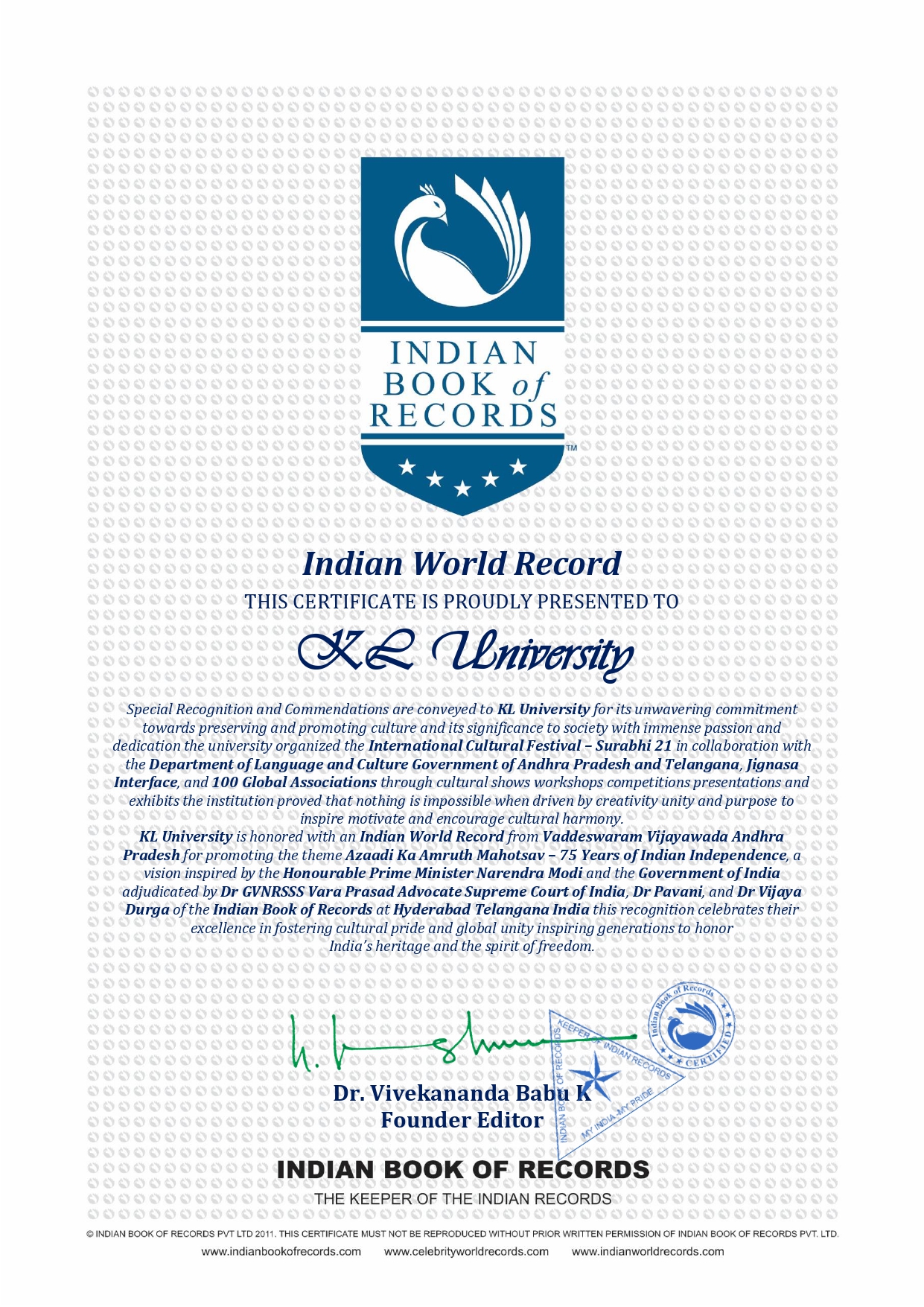 KL University is honored with an Indian World Record from Vaddeswaram Vijayawada Andhra Pradesh for promoting the theme Azaadi Ka Amruth Mahotsav – 75 Years of Indian Independence, a vision inspired by the Honourable Prime Minister Narendra Modi and the Government of India adjudicated by Dr GVNRSSS Vara Prasad Advocate Supreme Court of India, Dr Pavani, and Dr Vijaya Durga of the Indian Book of Records at Hyderabad Telangana India this recognition celebrates their excellence in fostering cultural pride and global unity inspiring generations to honor India’s heritage and the spirit of freedom.