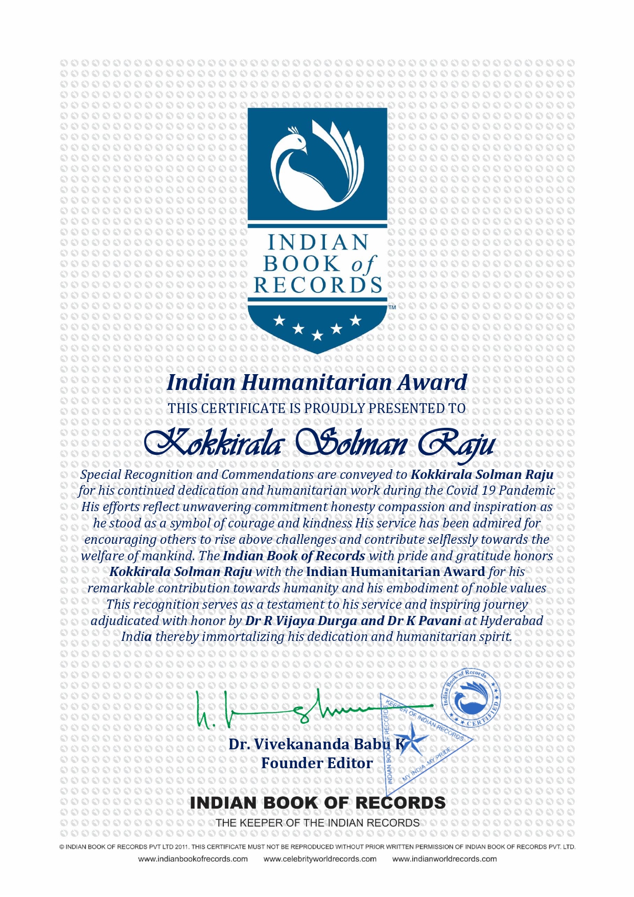 The Indian Book of Records with pride and gratitude honors Kokkirala Solman Raju with the Indian Humanitarian Award for his remarkable contribution towards humanity and his embodiment of noble values This recognition serves as a testament to his service and inspiring journey adjudicated with honor by Dr R Vijaya Durga and Dr K Pavani at Hyderabad India thereby immortalizing his dedication and humanitarian spirit.