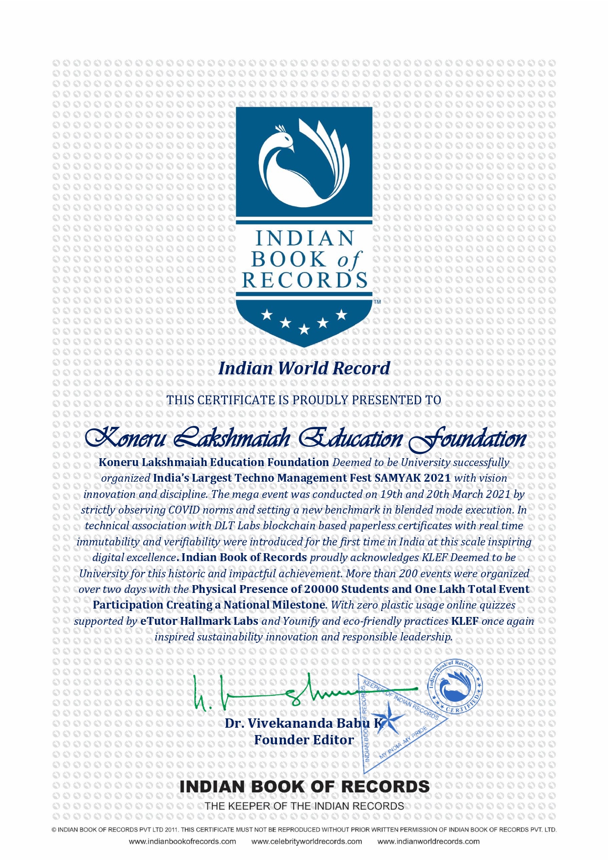 Indian Book of Records proudly acknowledges KLEF Deemed to be University for this historic and impactful achievement More than 200 events were organized over two days with the physical presence of 20000 students and one lakh total event participation creating a national milestone With zero plastic usage online quizzes supported by eTutor Hallmark Labs and Younify and eco friendly practices KLEF once again inspired sustainability innovation and responsible leadership.