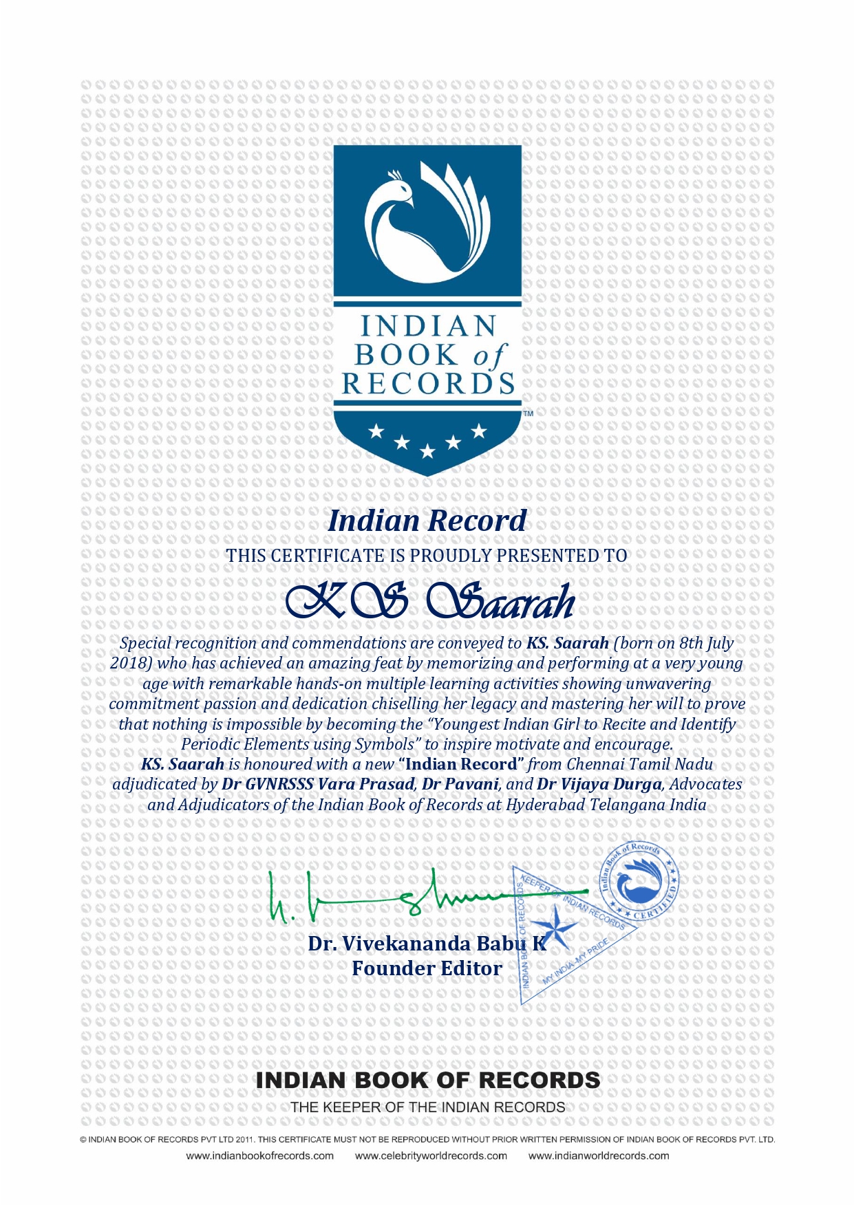 Special recognition and commendations are conveyed to KS Saarah (born on 8th July 2018) who has achieved an amazing feat by memorizing and performing at a very young age with remarkable hands-on multiple learning activities showing unwavering commitment passion and dedication chiselling her legacy and mastering her will to prove that nothing is impossible by becoming the “Youngest Indian Girl to Recite and Identify Periodic Elements using Symbols” to inspire motivate and encourage.