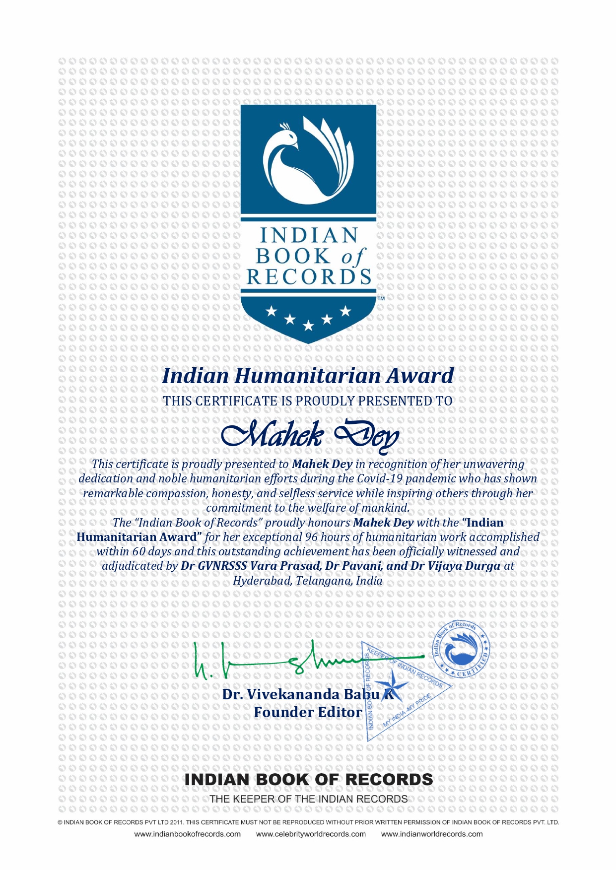 The “Indian Book of Records” proudly honours Mahek Dey with the “Indian Humanitarian Award” for her exceptional 96 hours of humanitarian work accomplished within 60 days and this outstanding achievement has been officially witnessed and adjudicated by Dr GVNRSSS Vara Prasad, Dr Pavani, and Dr Vijaya Durga at Hyderabad, Telangana, India.